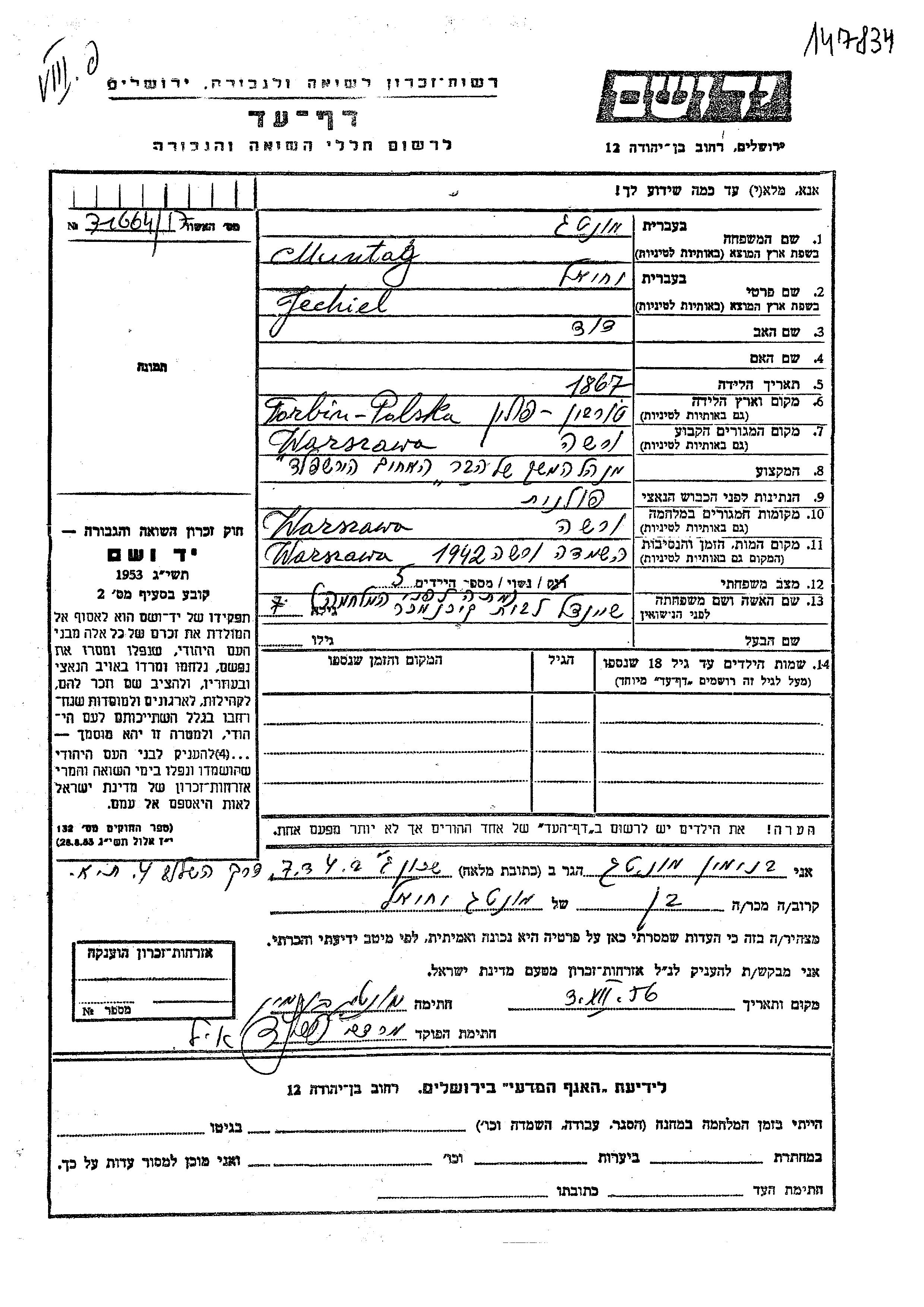 Jechiel wurde in der Schoah ermordet. Todesort: Warszawa, Polen im Jahr 1942.