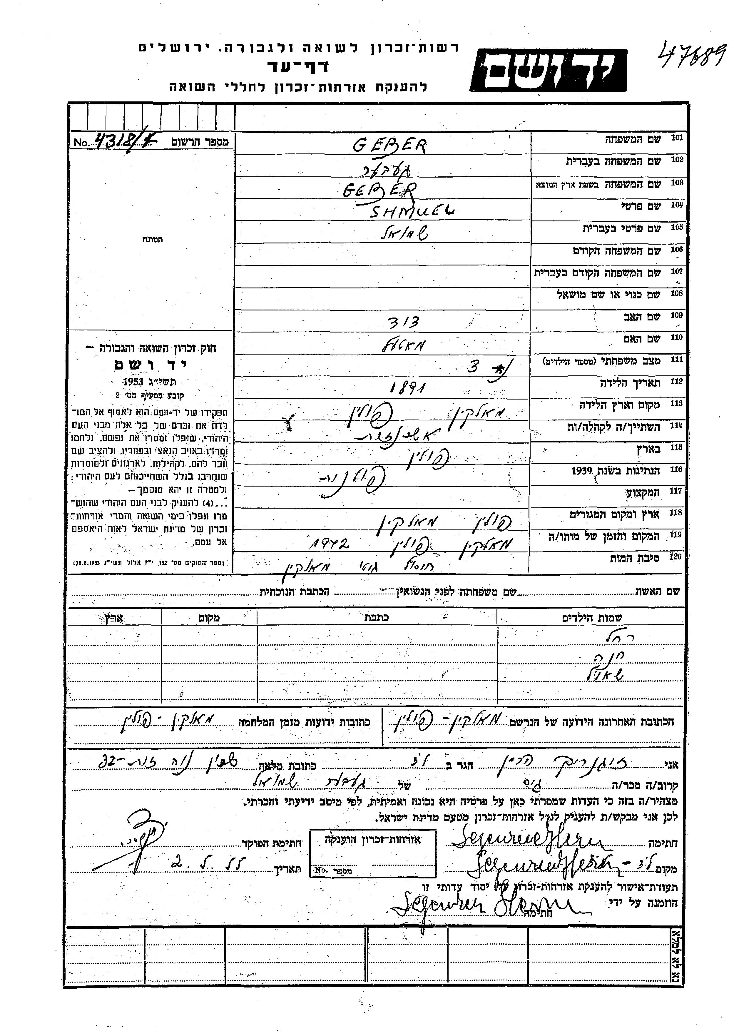 Shmuel Geber wurde im Jahr 1891 in Malkin, Polen geboren. Er war der Sohn von David und Matel. Er war Verheiratet. Vor dem Zweiten Weltkrieg lebte er in Malkin, Polen. Während des Krieges war er in Malkin, Polen.