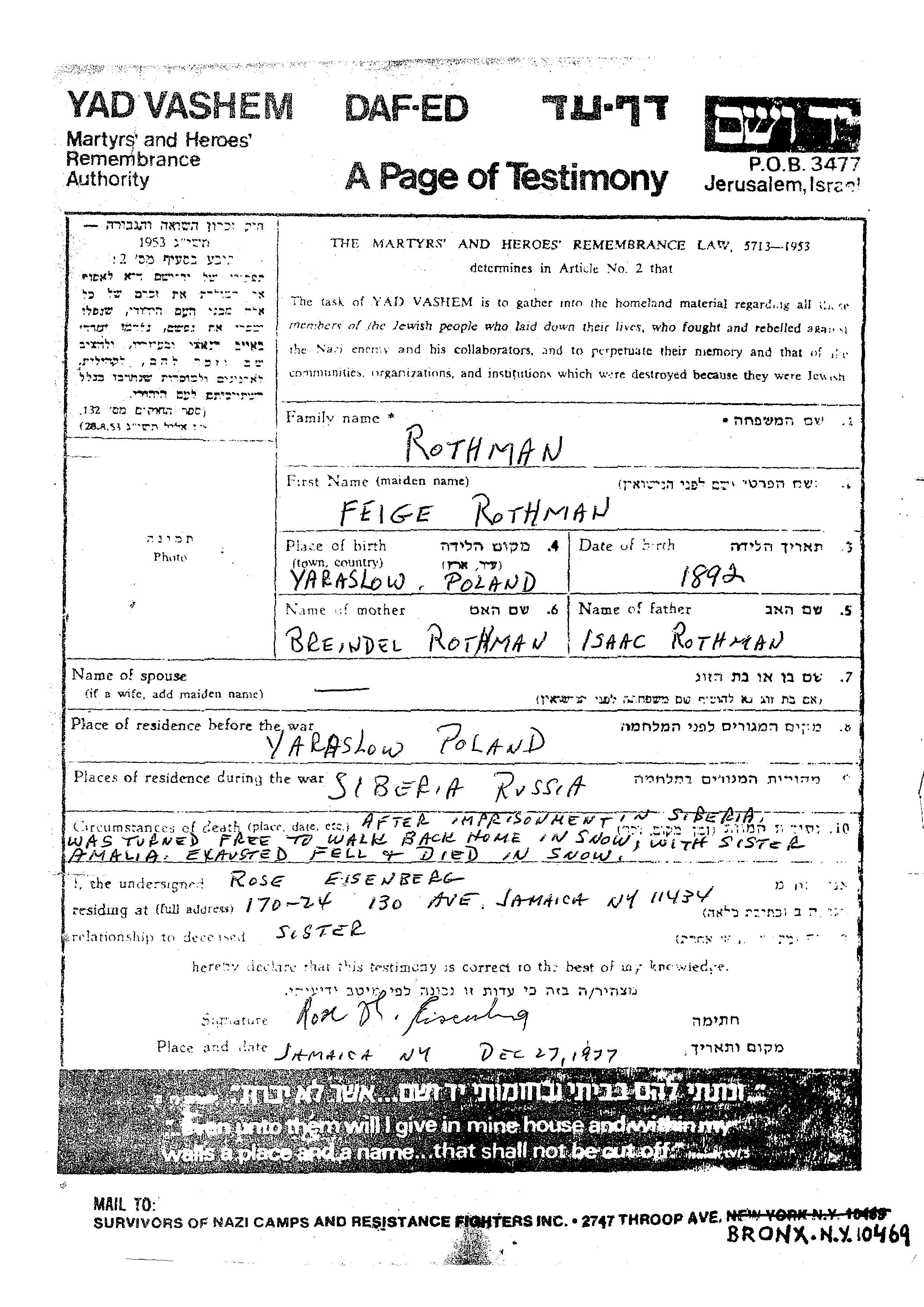 Feiga Rothman wurde im Jahr 1892 in Jaroslaw, Polen geboren. Sie war die Tochter von Isaac und Braindel. Vor dem Zweiten Weltkrieg lebte sie in Jaroslaw, Polen. Während des Krieges war sie in Siberia Region, Russland (UdSSR).