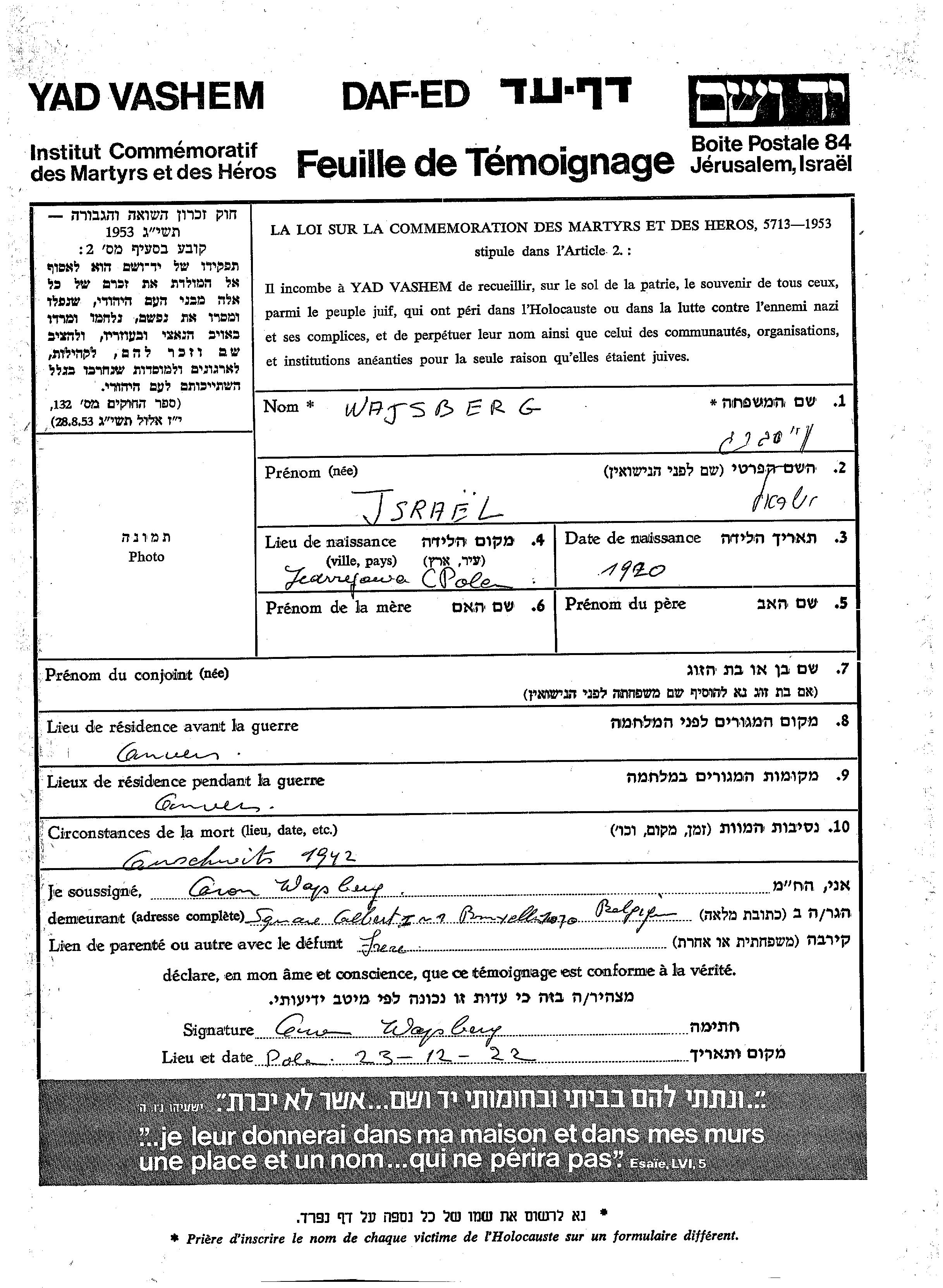 Israel wurde in der Schoah ermordet. Todesort: Auschwitz, Polen im Jahr 1942.