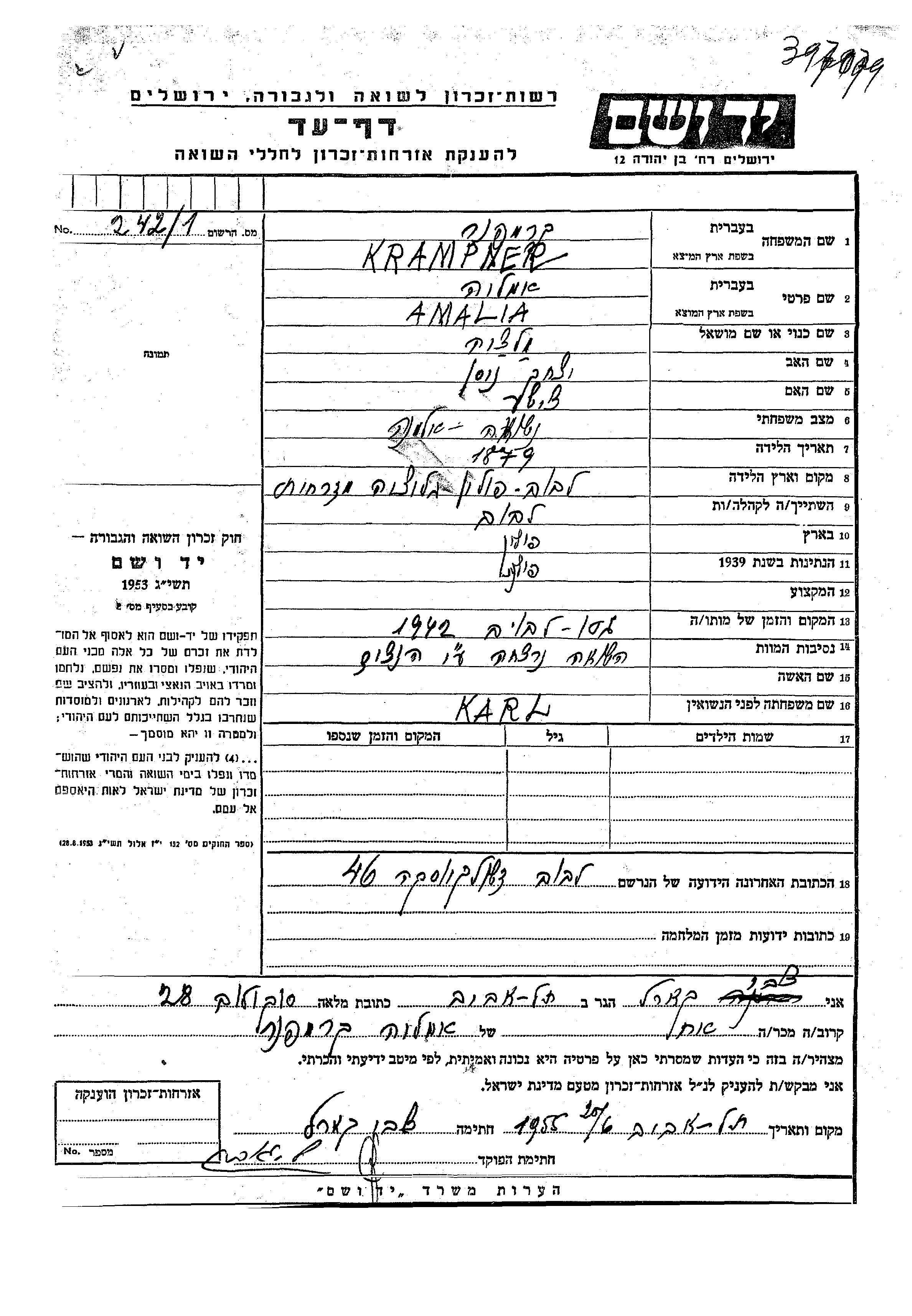 Amalia Krampner, geb. Karl wurde im Jahr 1879 in Lwow, Polen geboren. Sie war die Tochter von Yitzkhak Nisan und Tzishe. Sie war Witwe. Vor dem Zweiten Weltkrieg lebte sie in Lwow, Polen. Während des Krieges war sie in Lwow, Polen.
