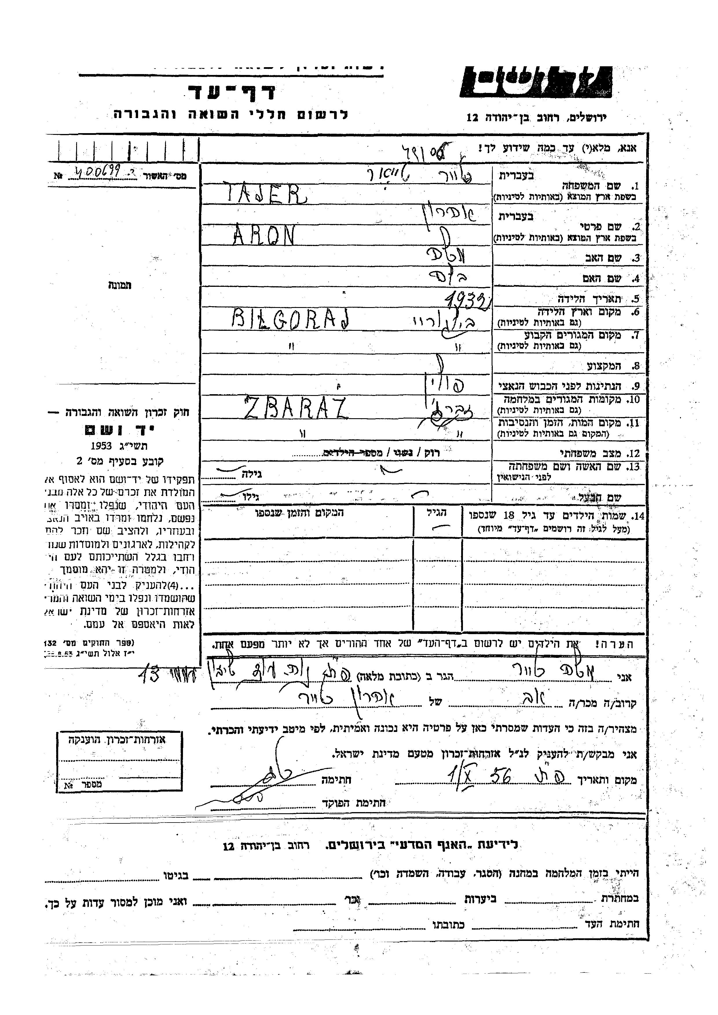 Aron Tajer wurde im Jahr 1932 geboren. Er war der Sohn von Moshe und Bela. Er war Ledig. Während des Krieges war er in Zbaraz, Polen.
