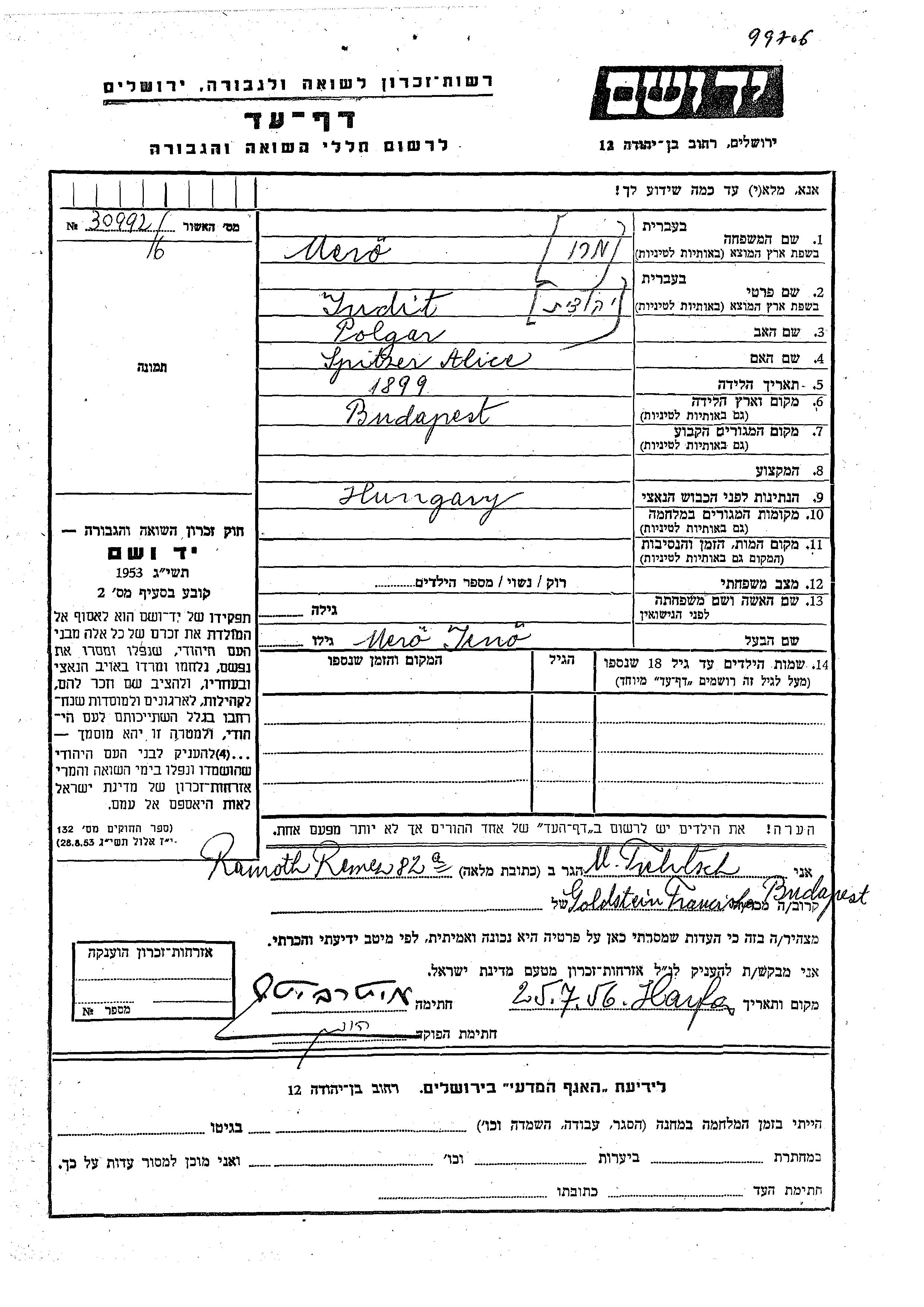 Yudit Mero Maru, geb. Polgar wurde im Jahr 1899 in Budapest, Ungarn geboren. Sie war die Tochter von Alice. Sie war mit Jeno Verheiratet.