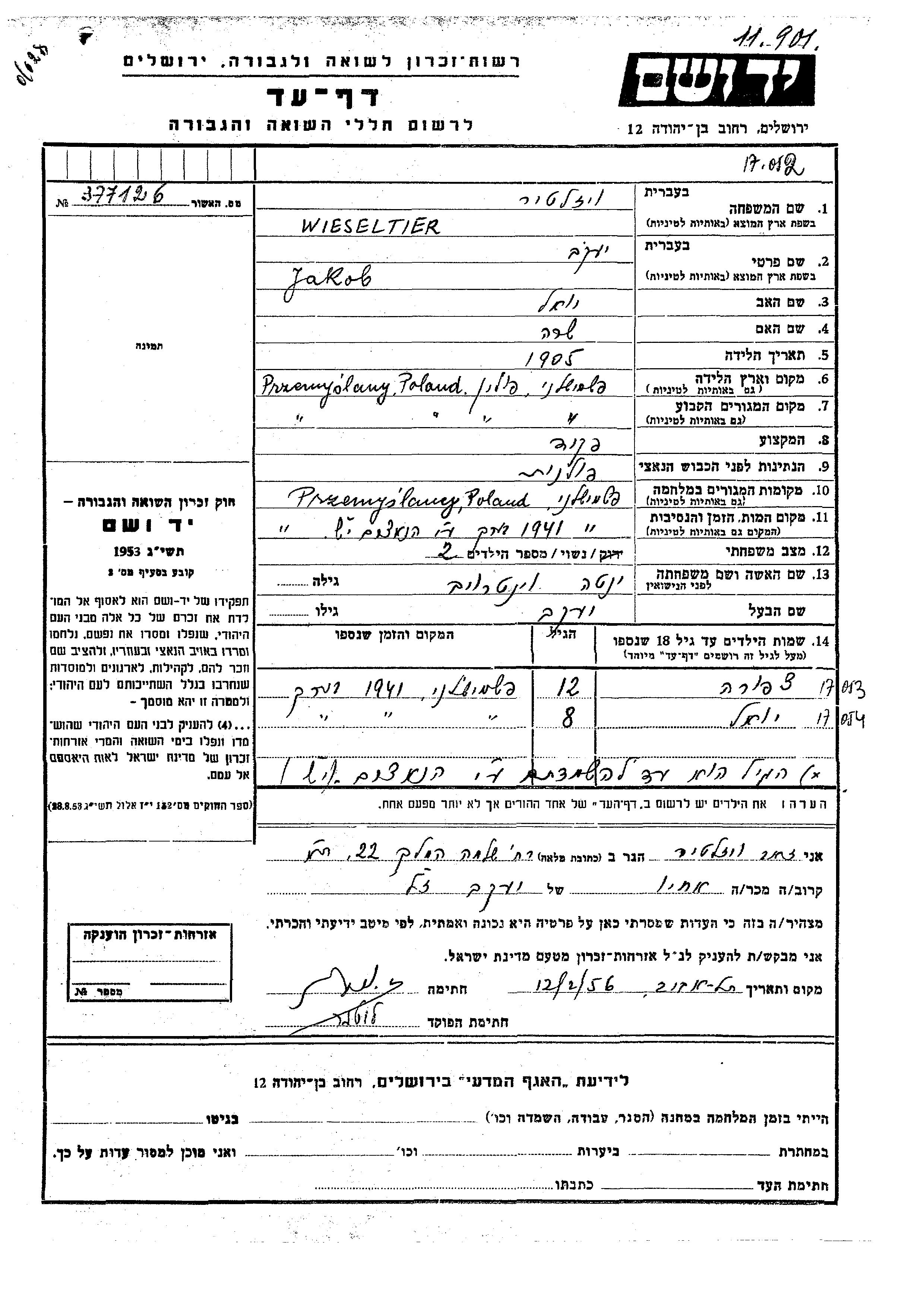 Yakob Wieseltier wurde im Jahr 1905 in Przemyslany, Polen geboren. Er war der Sohn von Yoel und Sara. Er war Angestellte/-r und mit Yenta, geb. Vintroib Verheiratet. Vor dem Zweiten Weltkrieg lebte er in Przemyslany, Polen. Während des Krieges war er in Przemyslany, Polen.