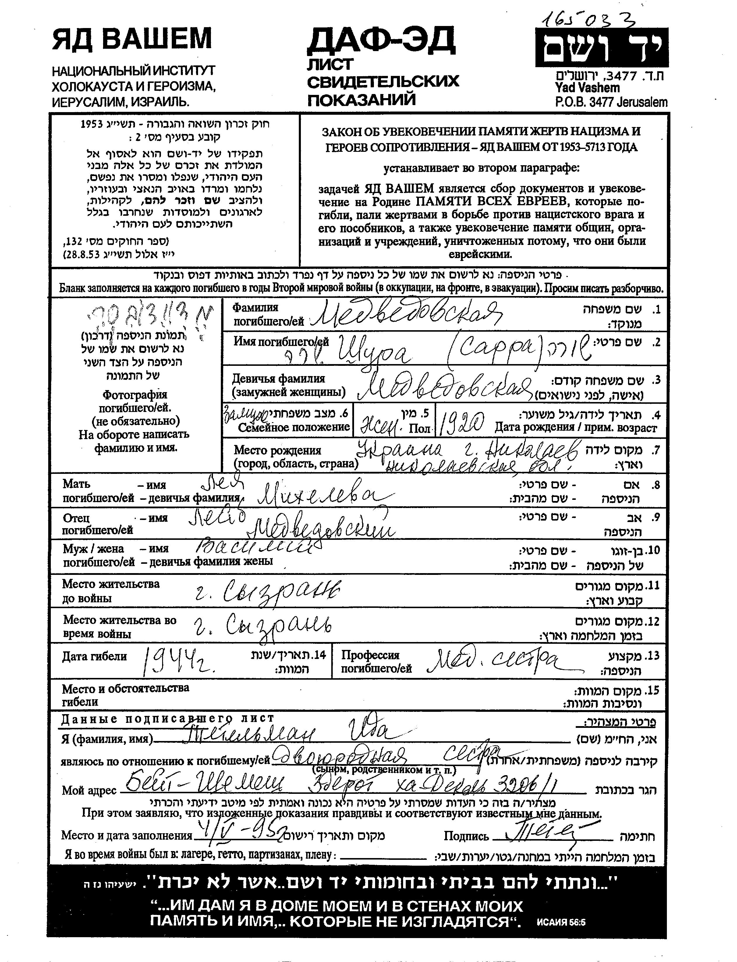 Shura Sara Medvedovski, geb. Medvedovski wurde im Jahr 1920 in Nikolayev, Ukraine (UdSSR) geboren. Sie war die Tochter von Leib und Lea, geb. Mikhelev. Sie war Krankenpfleger/-in und mit Vasili Verheiratet. Vor dem Zweiten Weltkrieg lebte sie in Syzran, Russland (UdSSR). Während des Krieges war sie in Syzran, Russland (UdSSR).