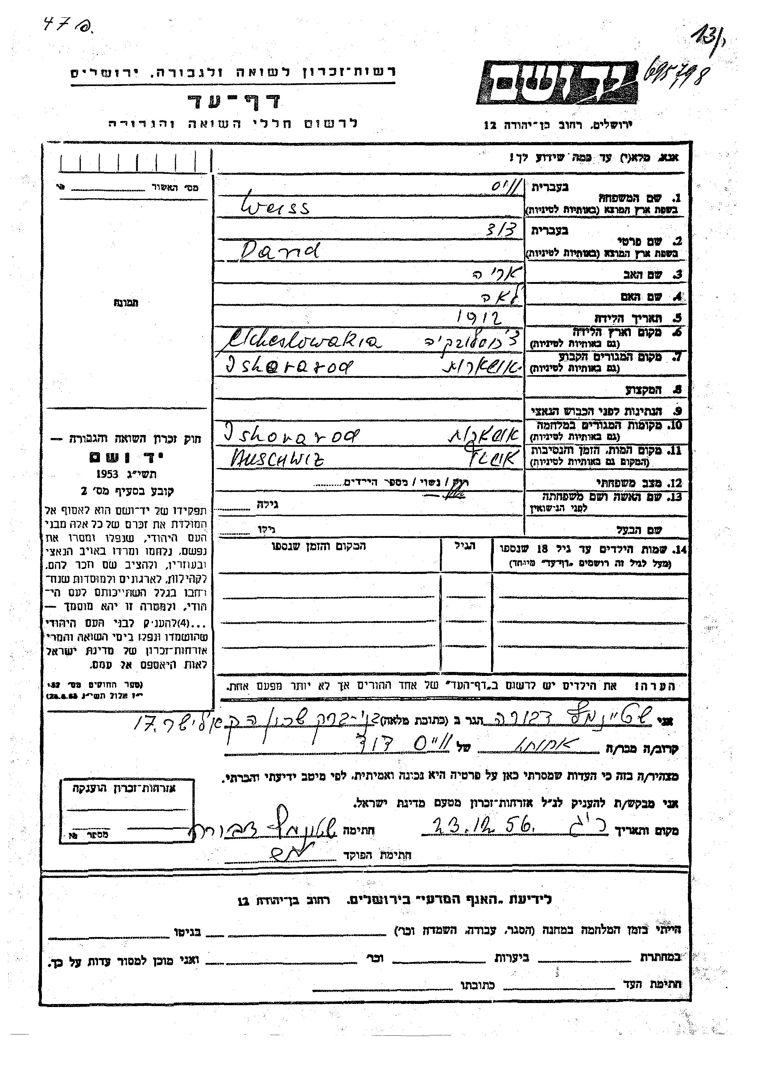 Weiss David 1912 Uzhorod, Tschechoslowakei Gedenkblatt