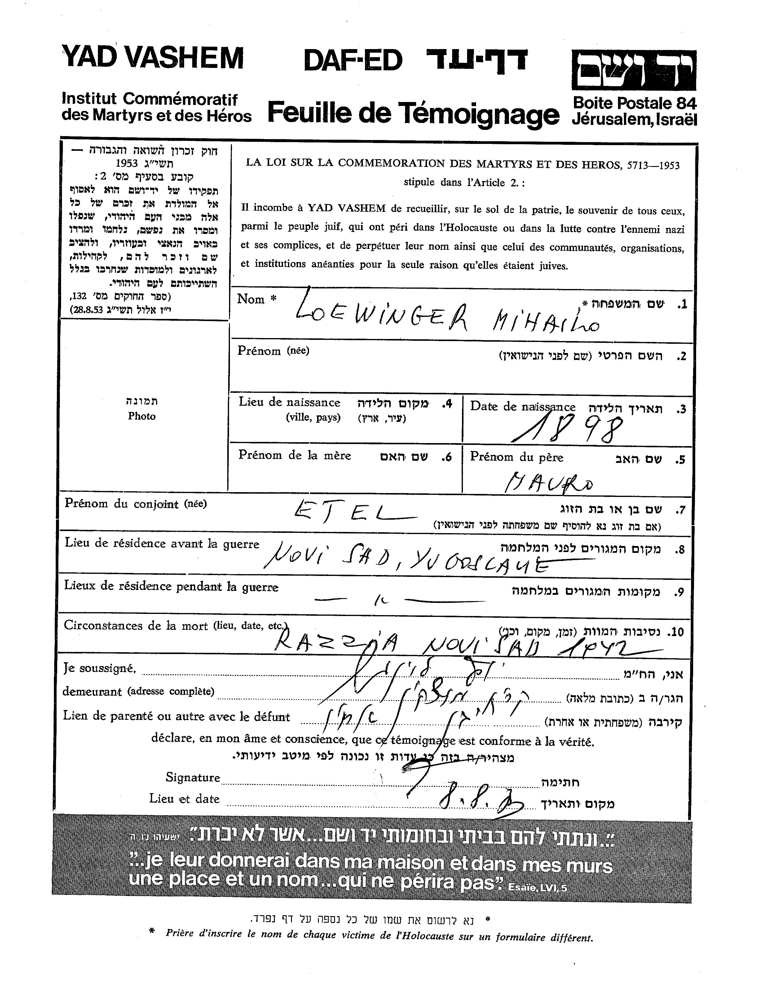 Mihailo Löwinger wurde im Jahr 1898 geboren. Er war der Sohn von Mauro. Er war mit Etel Verheiratet. Vor dem Zweiten Weltkrieg lebte er in Novi Sad, Jugoslawien. Während des Krieges war er in Novi Sad, Jugoslawien.