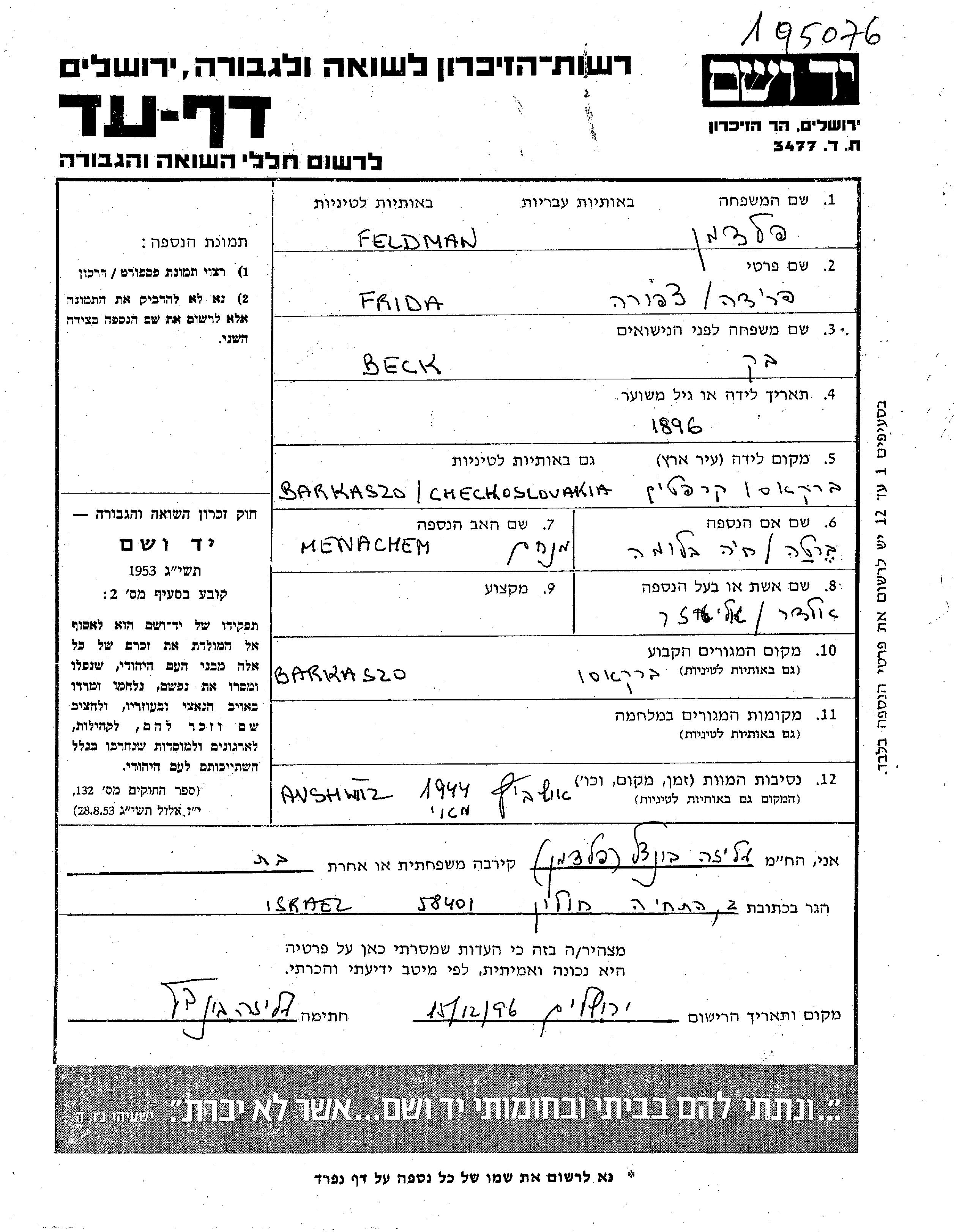 Tzipora Frida Feldman, geb. Beck wurde im Jahr 1901 in Barkasovo, Tschechoslowakei geboren. Sie war die Tochter von Mordekhai und Bluma. Sie war Hausfrau und mit Eliezer Verheiratet. Vor dem Zweiten Weltkrieg lebte sie in Barkasovo, Tschechoslowakei. Während des Krieges war sie in Barkasovo, Tschechoslowakei.