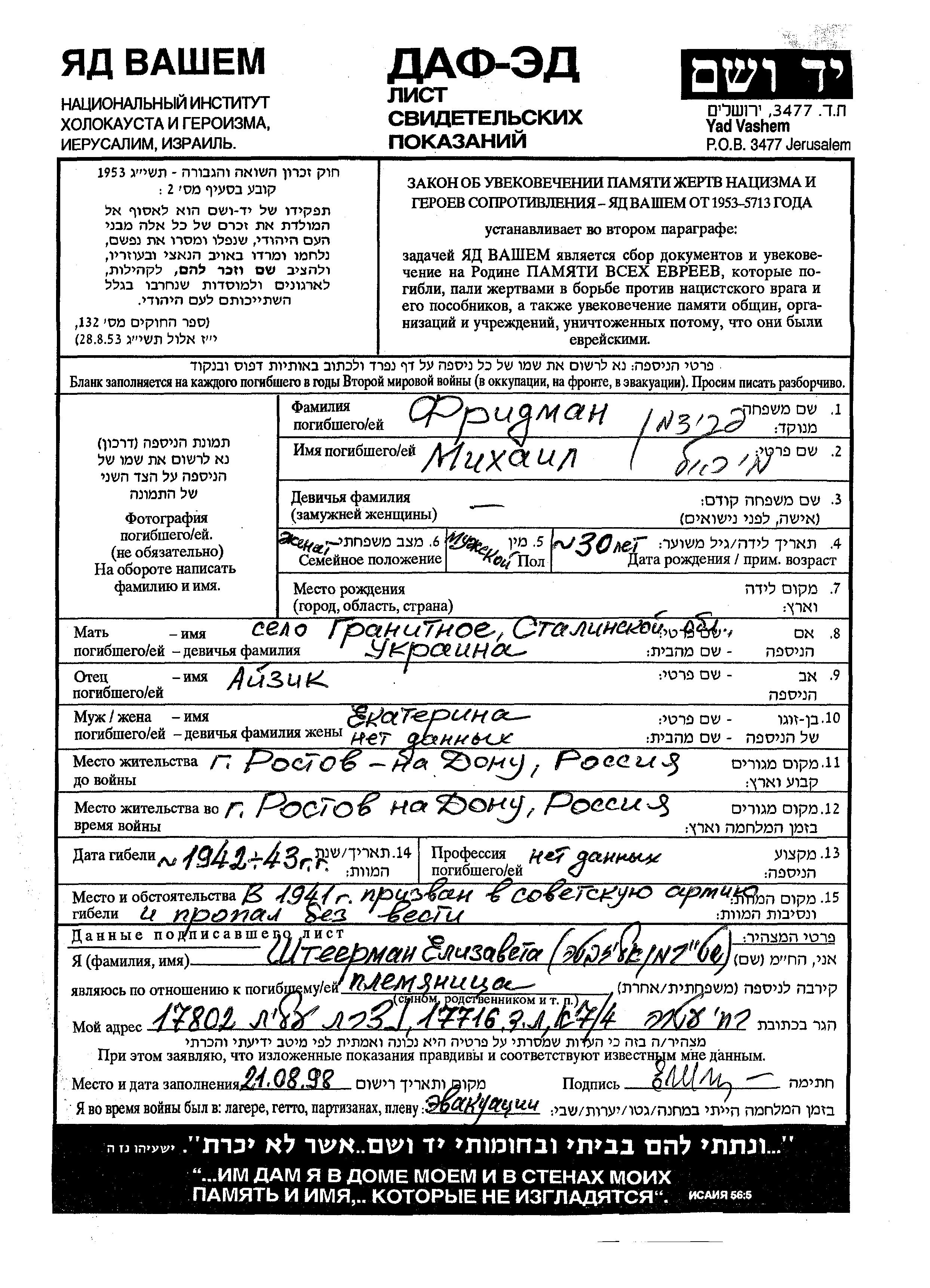 Mikhail wurde in der Schoah ermordet. Todesort: die Sowjetischen Streitkräfte im Jahr 1942-1943.