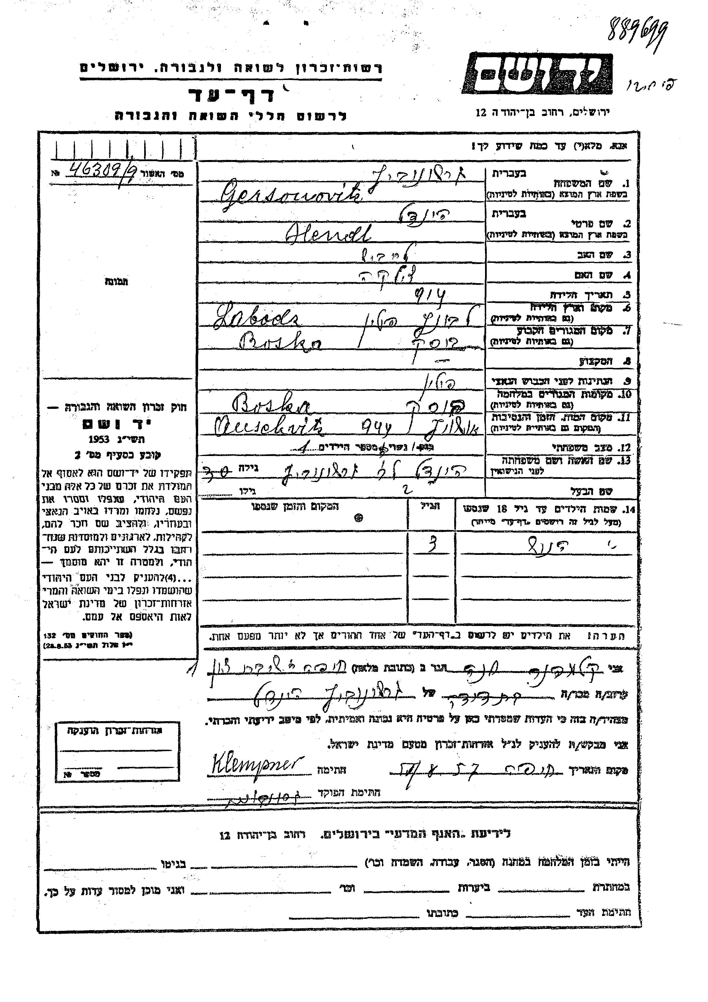 Hendl Hindel Gersonovitz wurde im Jahr 1914 in Labedz, Polen geboren. Sie war die Tochter von Leibish und Tzila. Sie war Verheiratet. Vor dem Zweiten Weltkrieg lebte sie in Busko, Polen. Während des Krieges war sie in Busko, Polen.