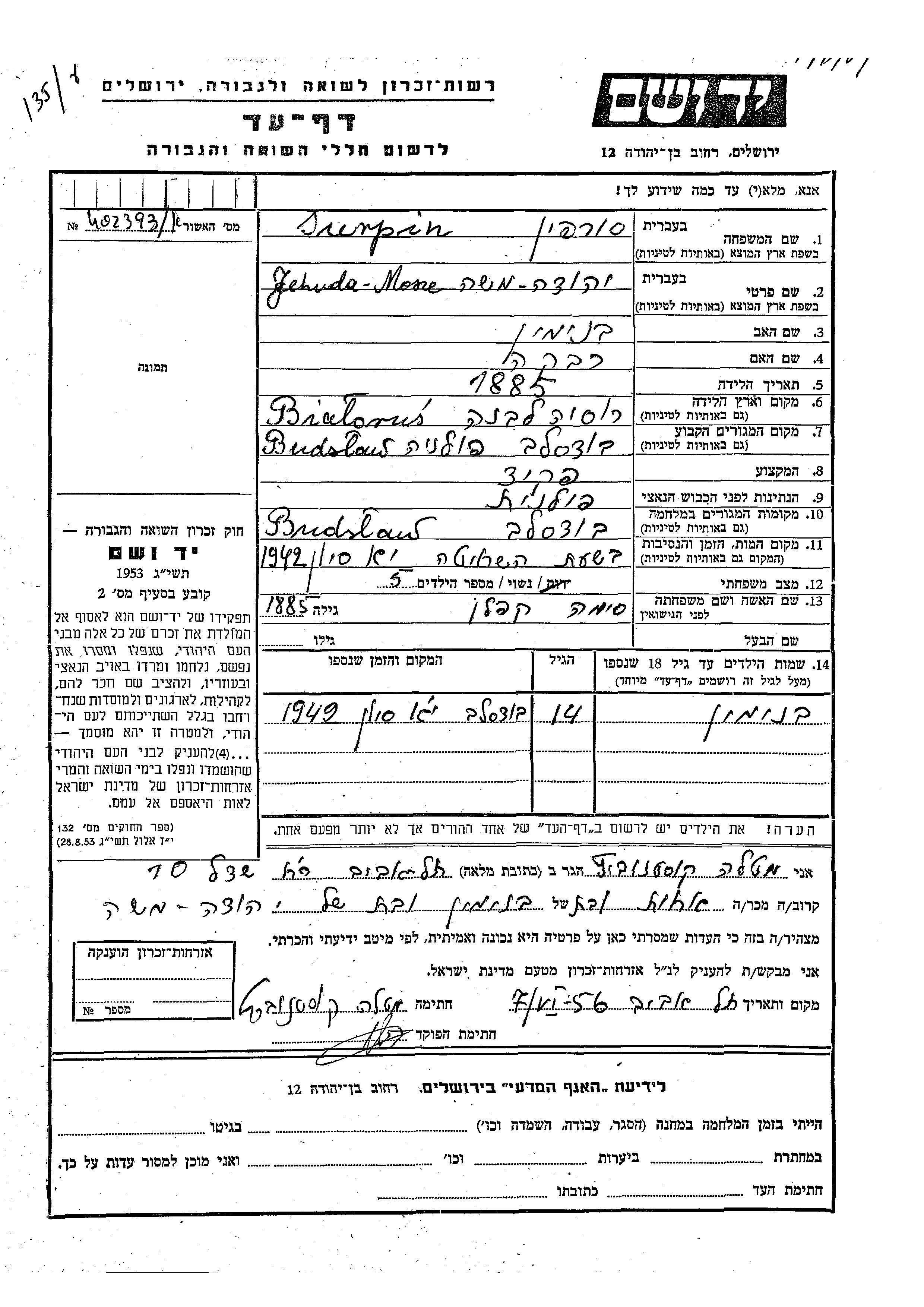 Mosze Yehuda wurde in der Schoah ermordet. Todesort: Budslaw, Polen im Jahr 1942.