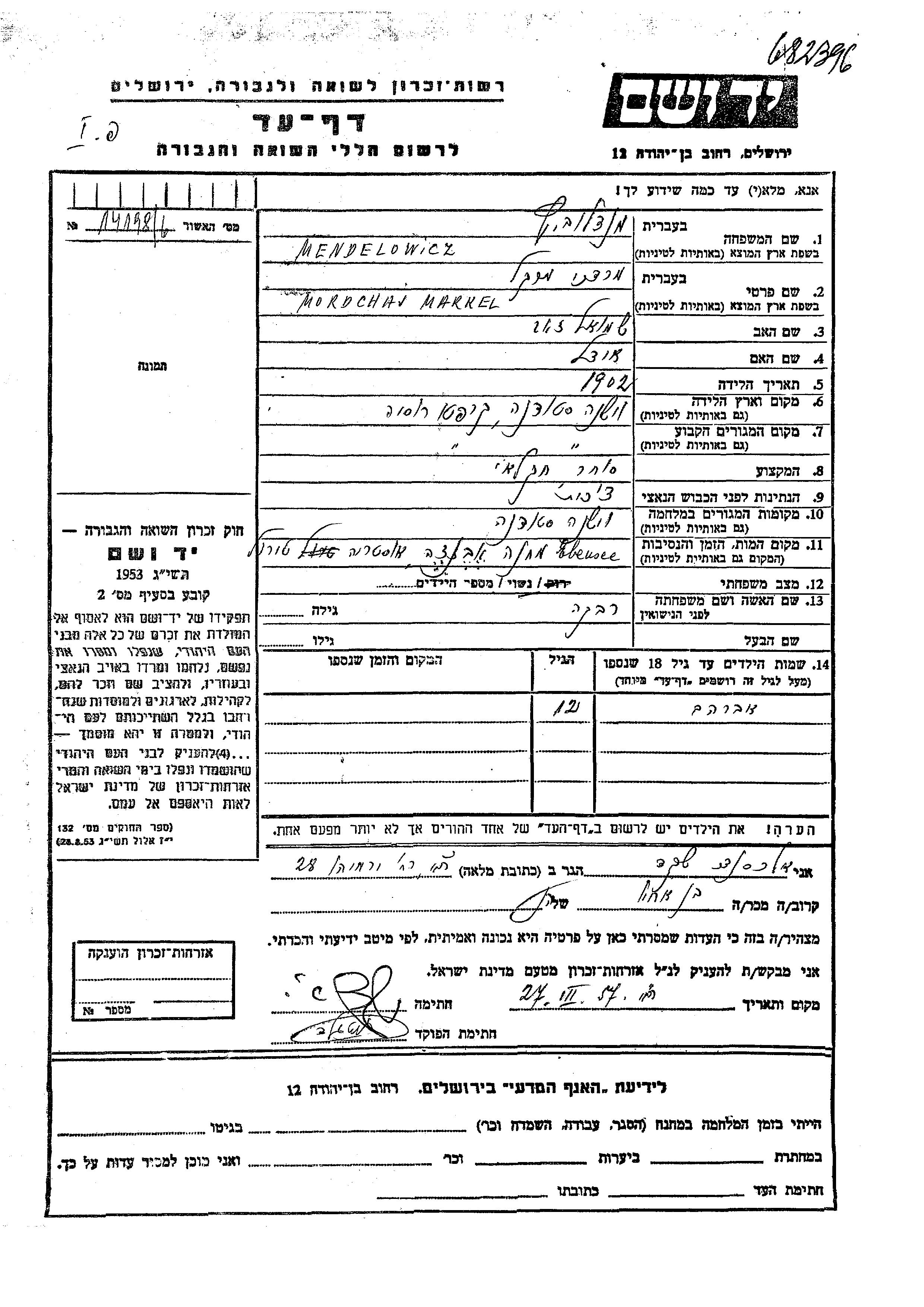 Mordchai Mark Mendelowicz wurde im Jahr 1902 in Vysni Studeny, Tschechoslowakei geboren. Er war der Sohn von Shmuel Zeev und Idl. Er war Landwirt und mit Rivka Verheiratet. Vor dem Zweiten Weltkrieg lebte er in Vysni Studeny, Tschechoslowakei. Während des Krieges war er in Vysni Studeny, Tschechoslowakei.
