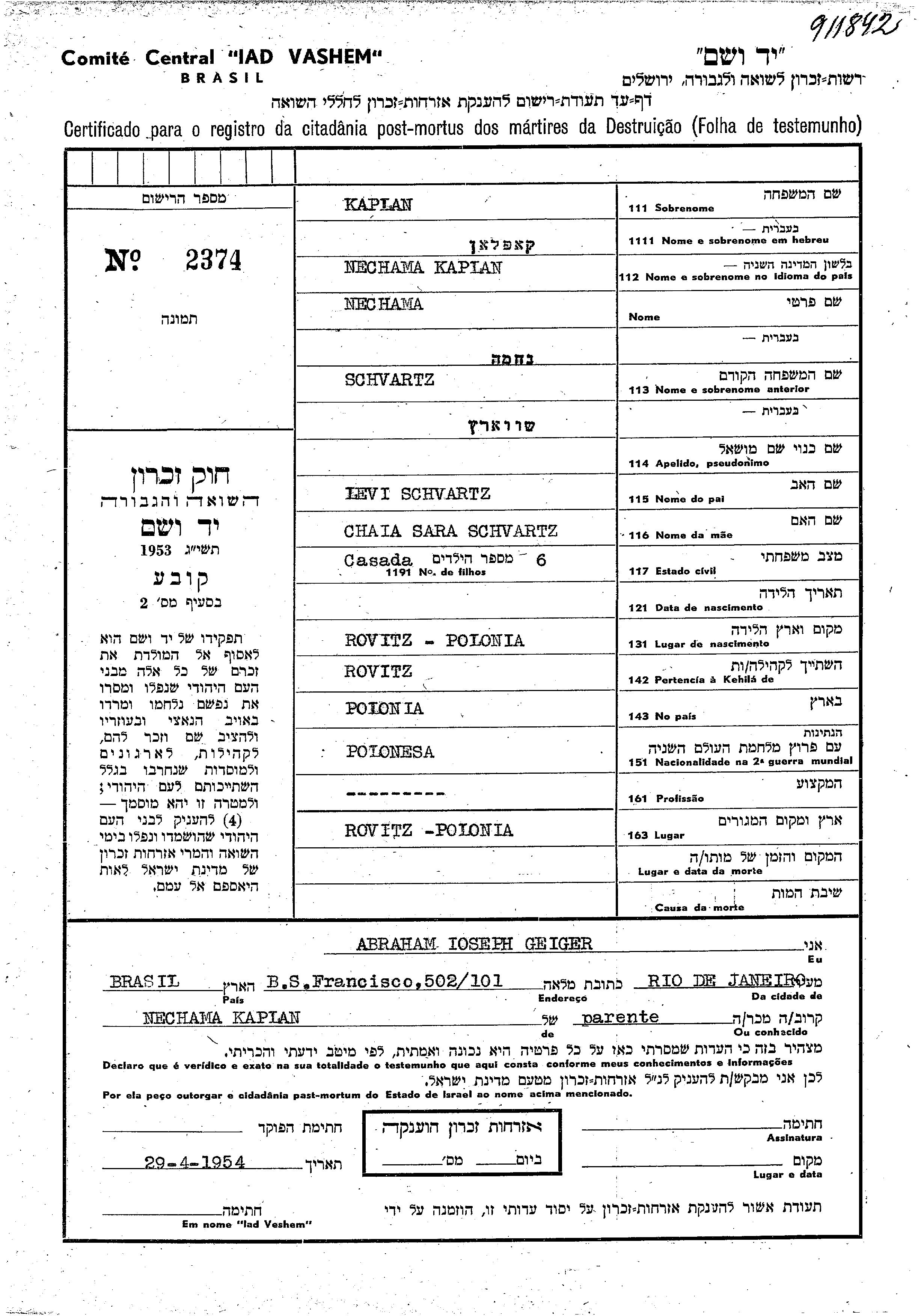 Nechama Kaplan, geb. Schvartz wurde in Rovitz, Polen geboren. Sie war die Tochter von Levi und Chaia Sara. Sie war Verheiratet. Vor dem Zweiten Weltkrieg lebte sie in Rovitz, Polen. Während des Krieges war sie in Rovitz, Polen.
