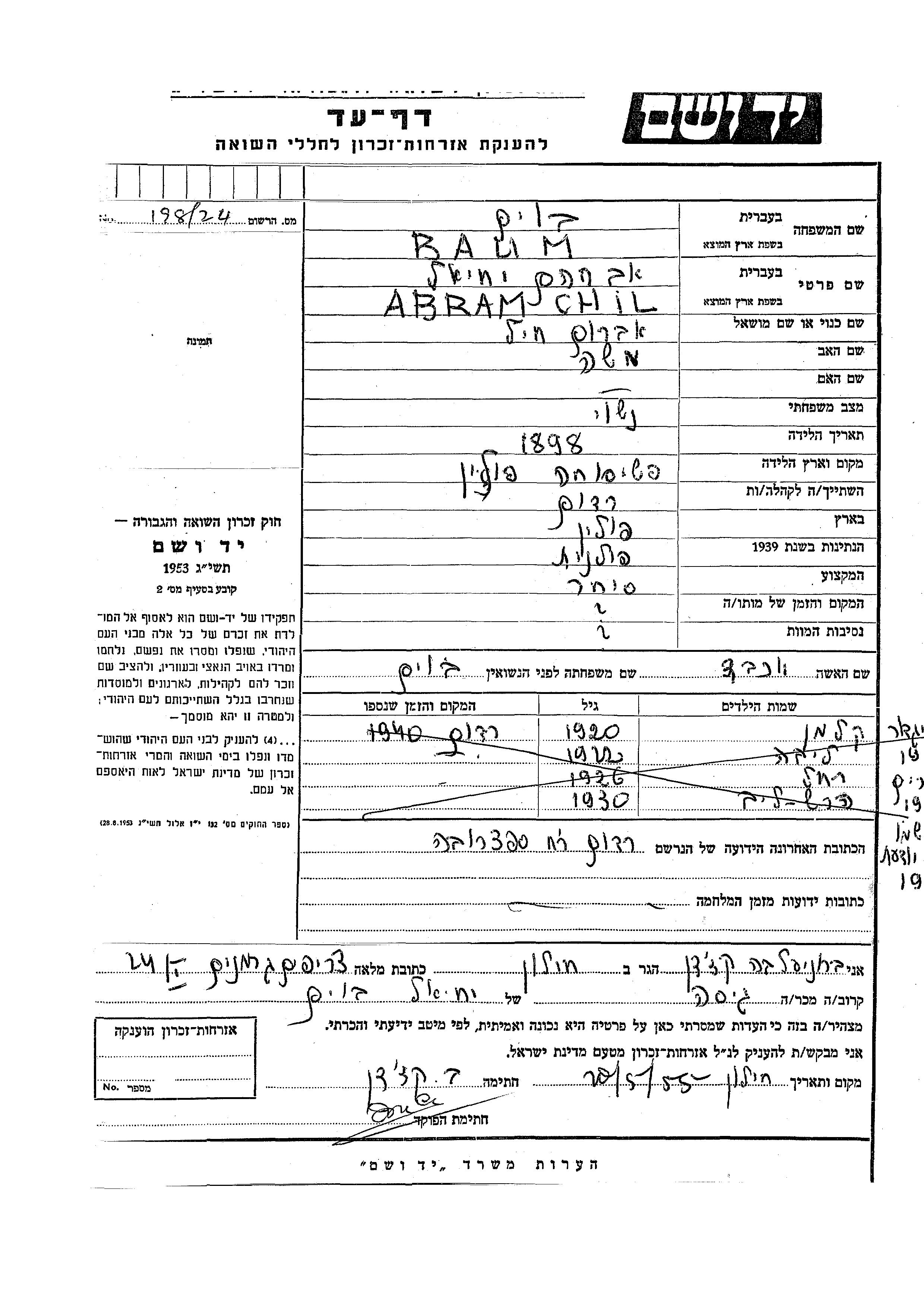 Abram Chil Baum wurde im Jahr 1898 in Pshischa, Polen geboren. Er war der Sohn von Moshe. Er war Kaufmann/-frau und mit Yokheved Verheiratet.