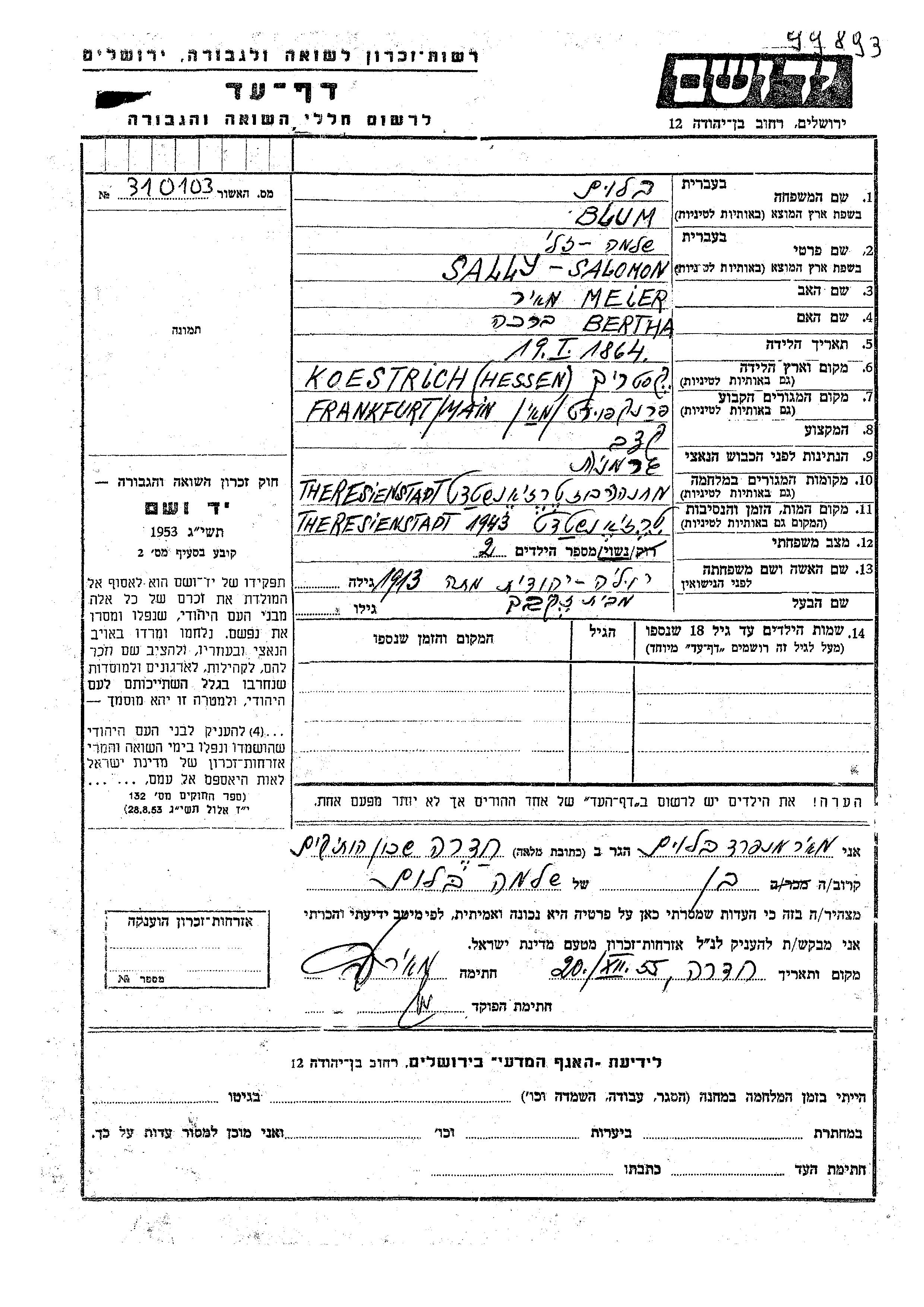 Sally Zali Blum wurde im Jahr 1864 in Kestrich, Deutsches Reich geboren. Er war der Sohn von Meir und Bertha Brakha. Er war Metzger/-in und mit Yulia Yehudit, geb. Zekbakh Verheiratet. Vor dem Zweiten Weltkrieg lebte er in Frankfurt am Main, Deutsches Reich. Während des Krieges war er in Theresienstadt, Tschechoslowakei.