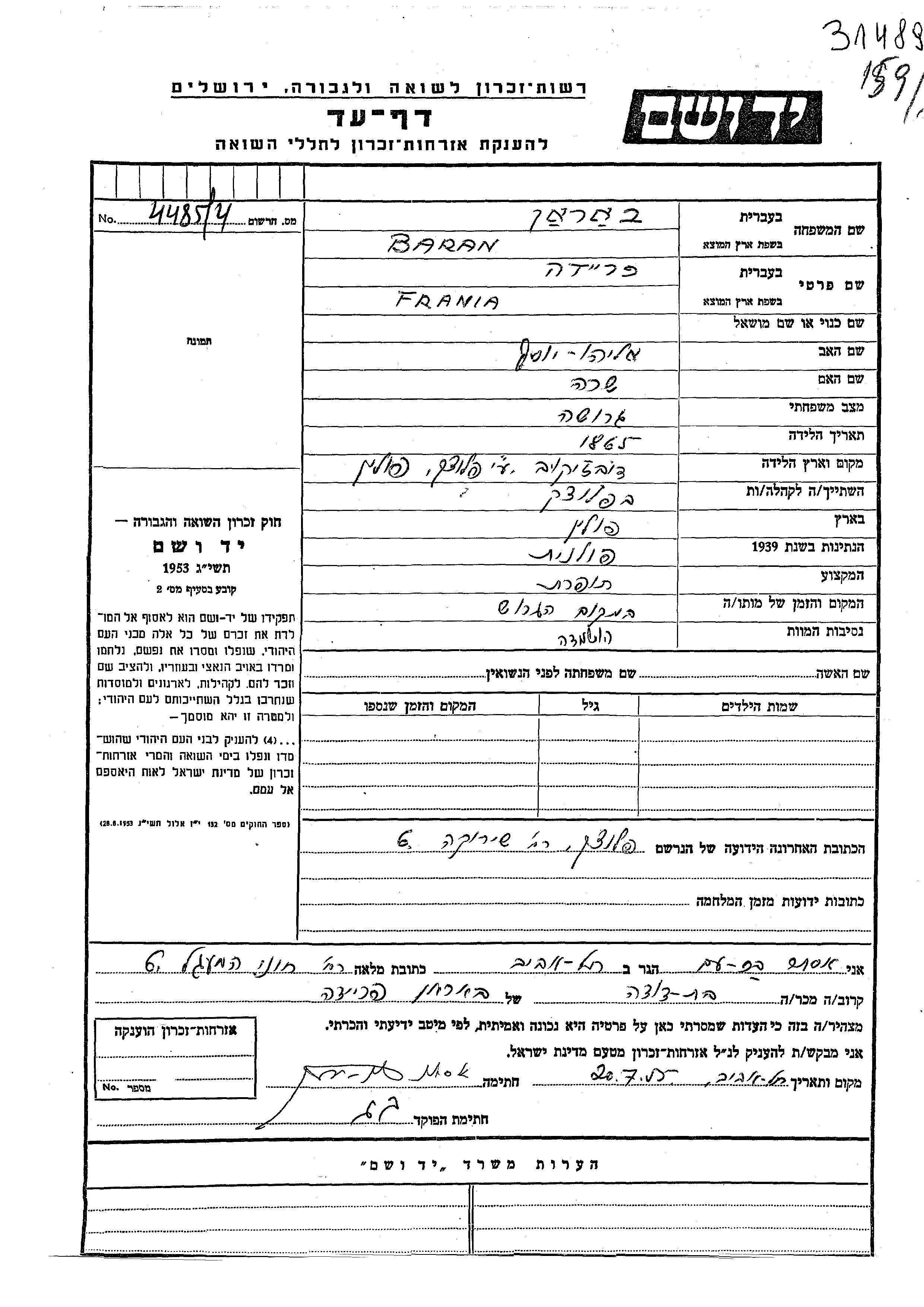 Frania Freida Baran wurde im Jahr 1865 in Dobrzykow, Polen geboren. Sie war die Tochter von Eliahu Yosef und Sara. Sie war Schneiderin und Geschieden. Vor dem Zweiten Weltkrieg lebte sie in Plock, Polen. Während des Krieges war sie in Plock, Polen.