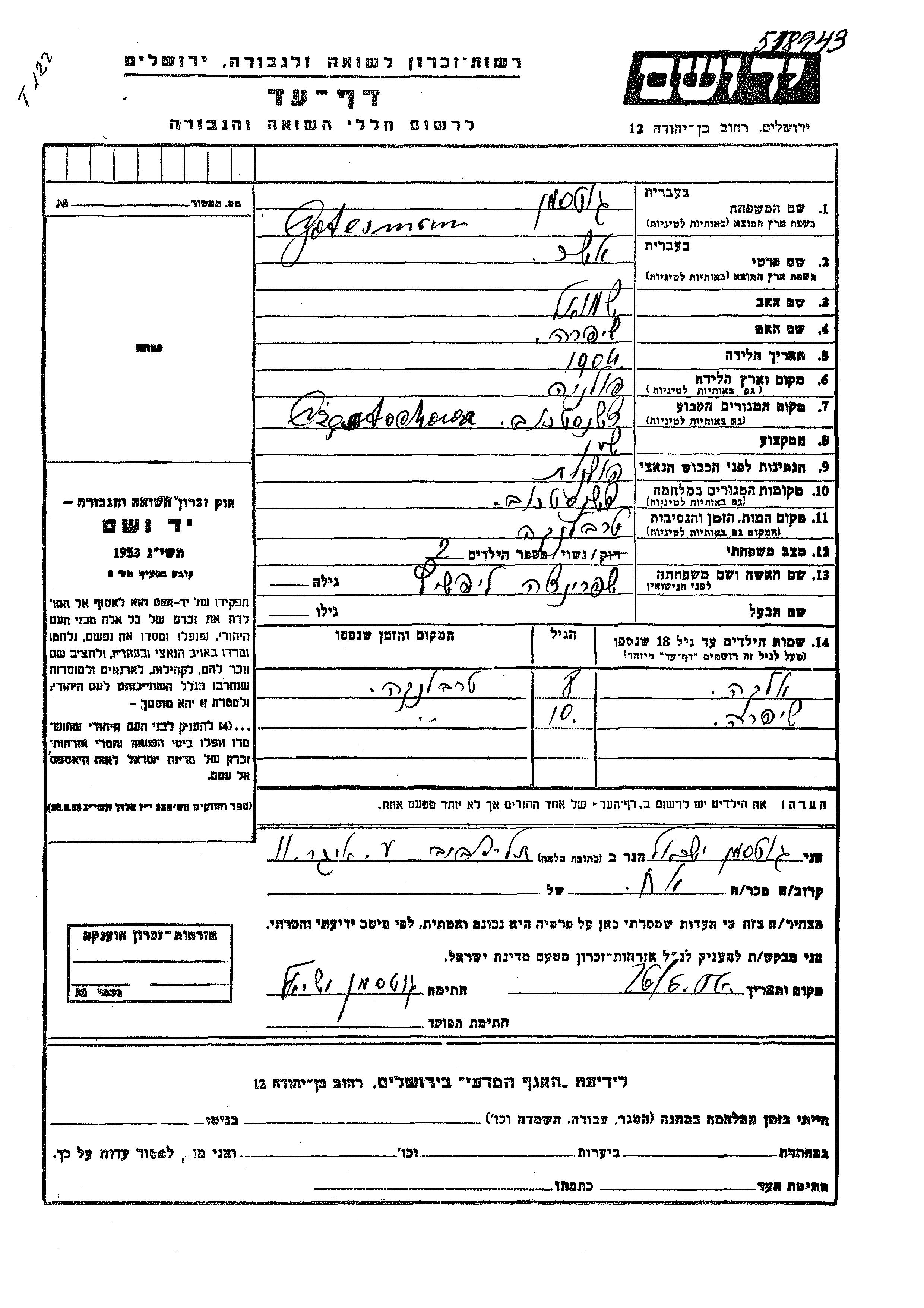 Asher Gotesman wurde im Jahr 1904 in Polen geboren. Er war der Sohn von Shmuel und Shifra. Er war Uhrmacher/-in und mit Shprintza, geb. Lifshitz Verheiratet. Vor dem Zweiten Weltkrieg lebte er in Czestochowa, Polen. Während des Krieges war er in Czestochowa, Polen.