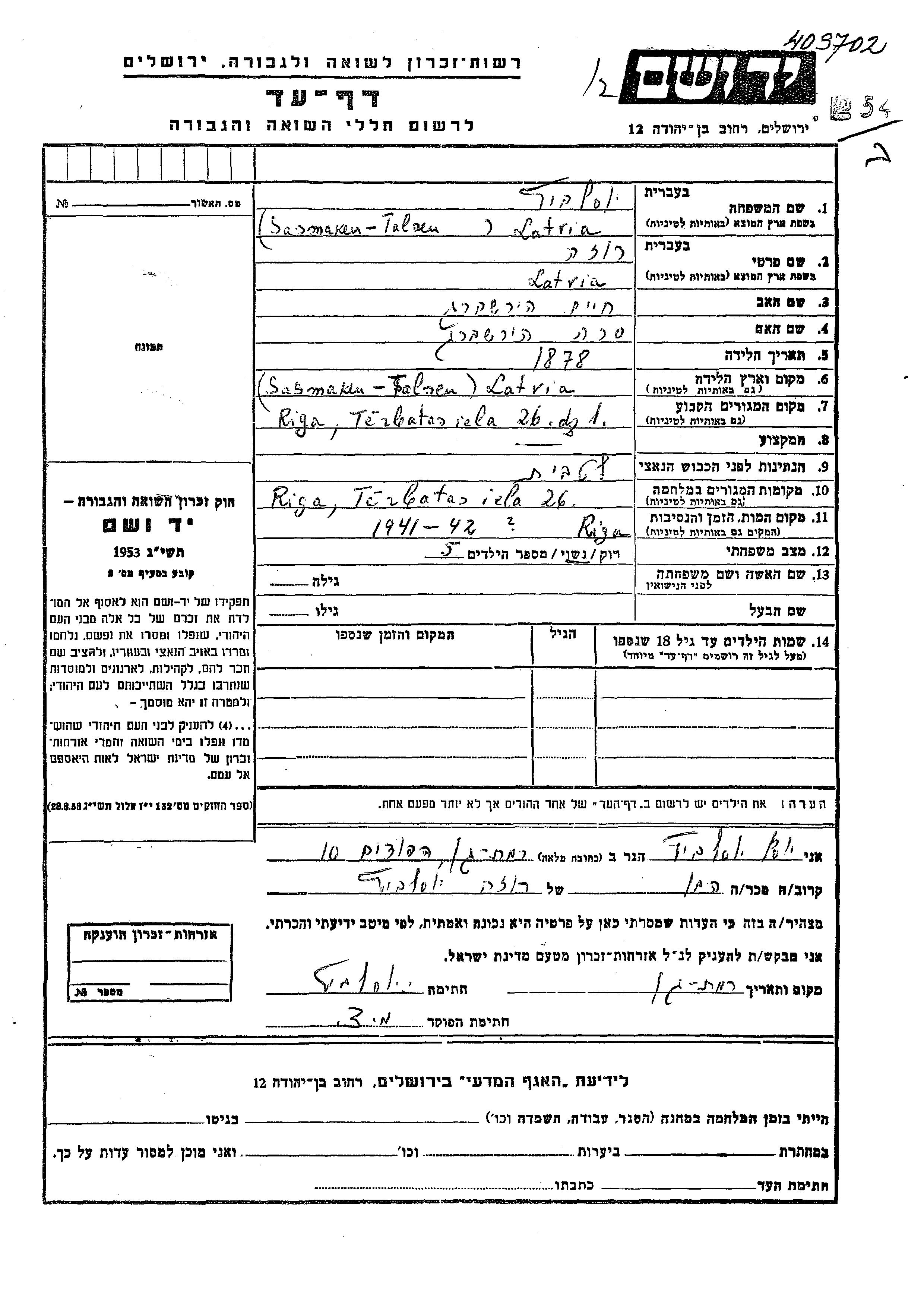 Roza wurde in der Schoah ermordet. Todesort: Riga, Lettland im Jahr 1941.
