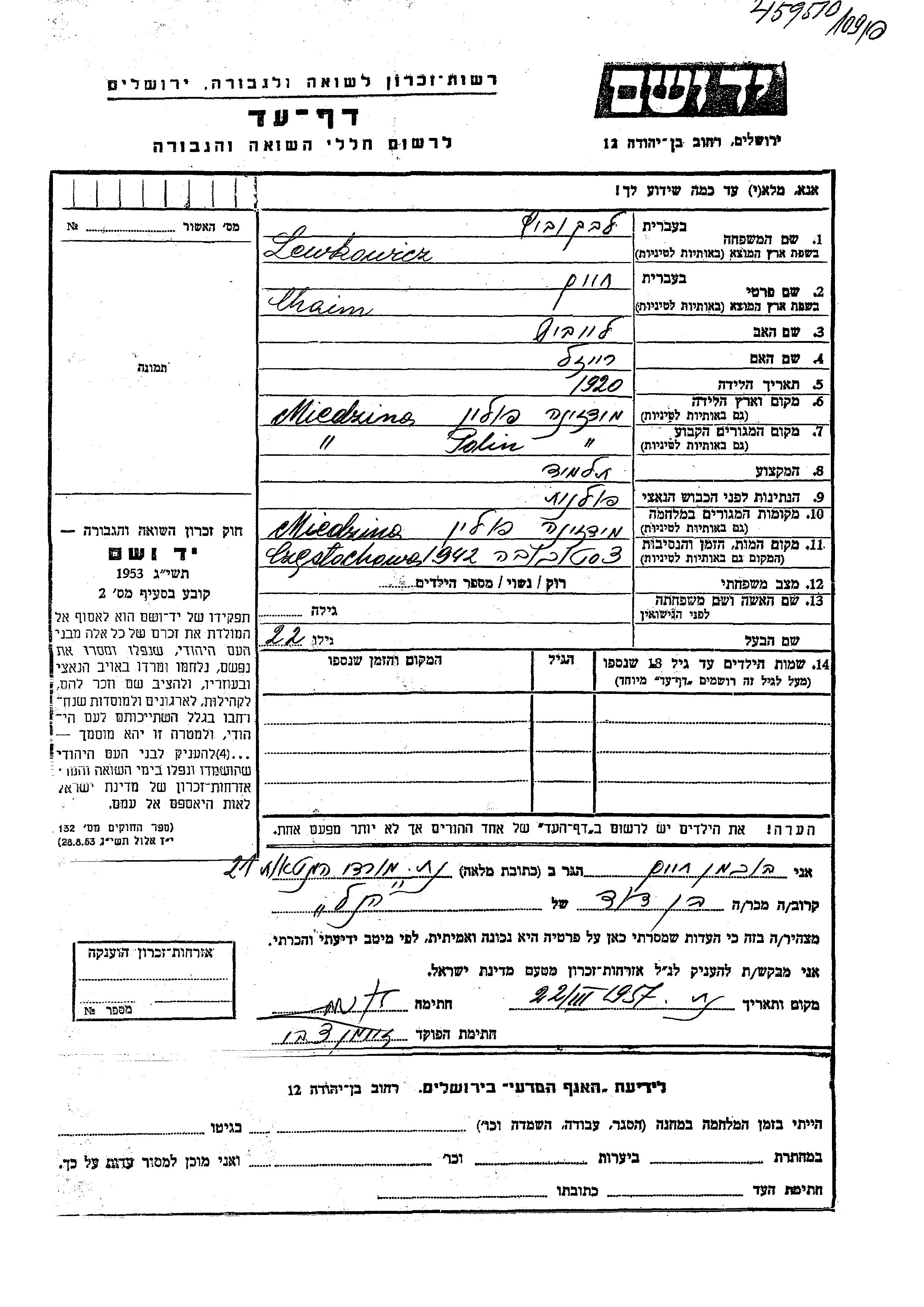 Chaim Lewkowicz wurde im Jahr 1920 in Miedzina, Polen geboren. Er war der Sohn von Leibish und Reizl. Er war Schüler/-in. Vor dem Zweiten Weltkrieg lebte er in Miedzina, Polen. Während des Krieges war er in Miedzina, Polen.
