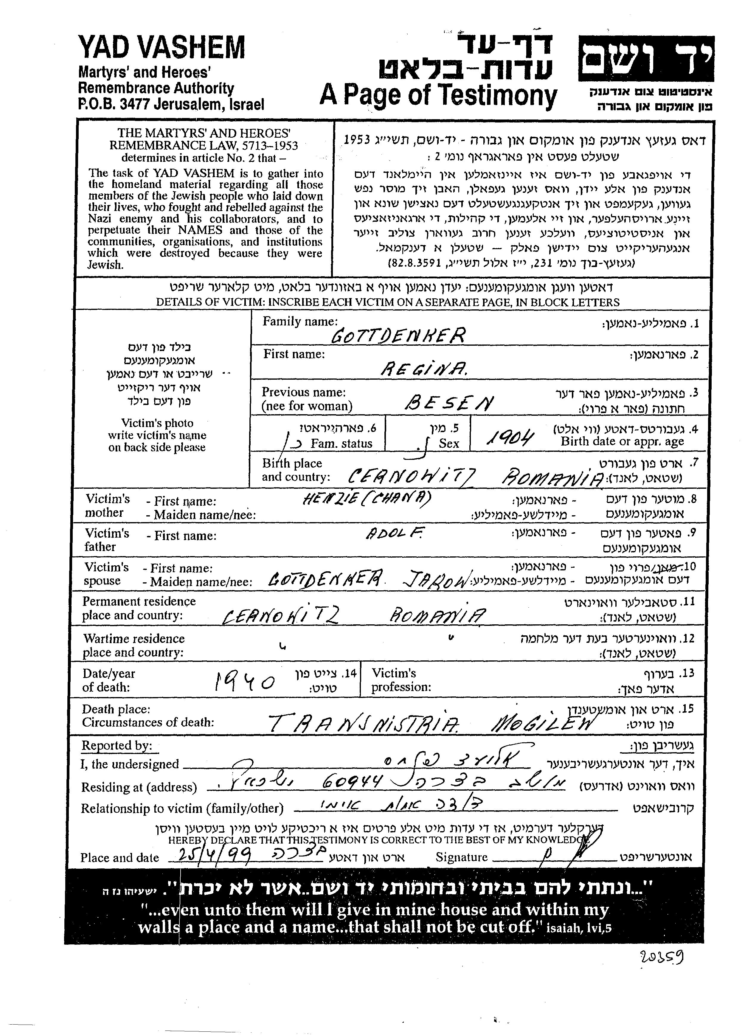 Regina Gottdenker, geb. Besen wurde im Jahr 1904 in Czernowitz, Rumänien geboren. Sie war die Tochter von Adolf und Henzie. Sie war mit Yarochim Verheiratet. Vor dem Zweiten Weltkrieg lebte sie in Czernowitz, Rumänien. Während des Krieges war sie in Czernowitz, Rumänien.