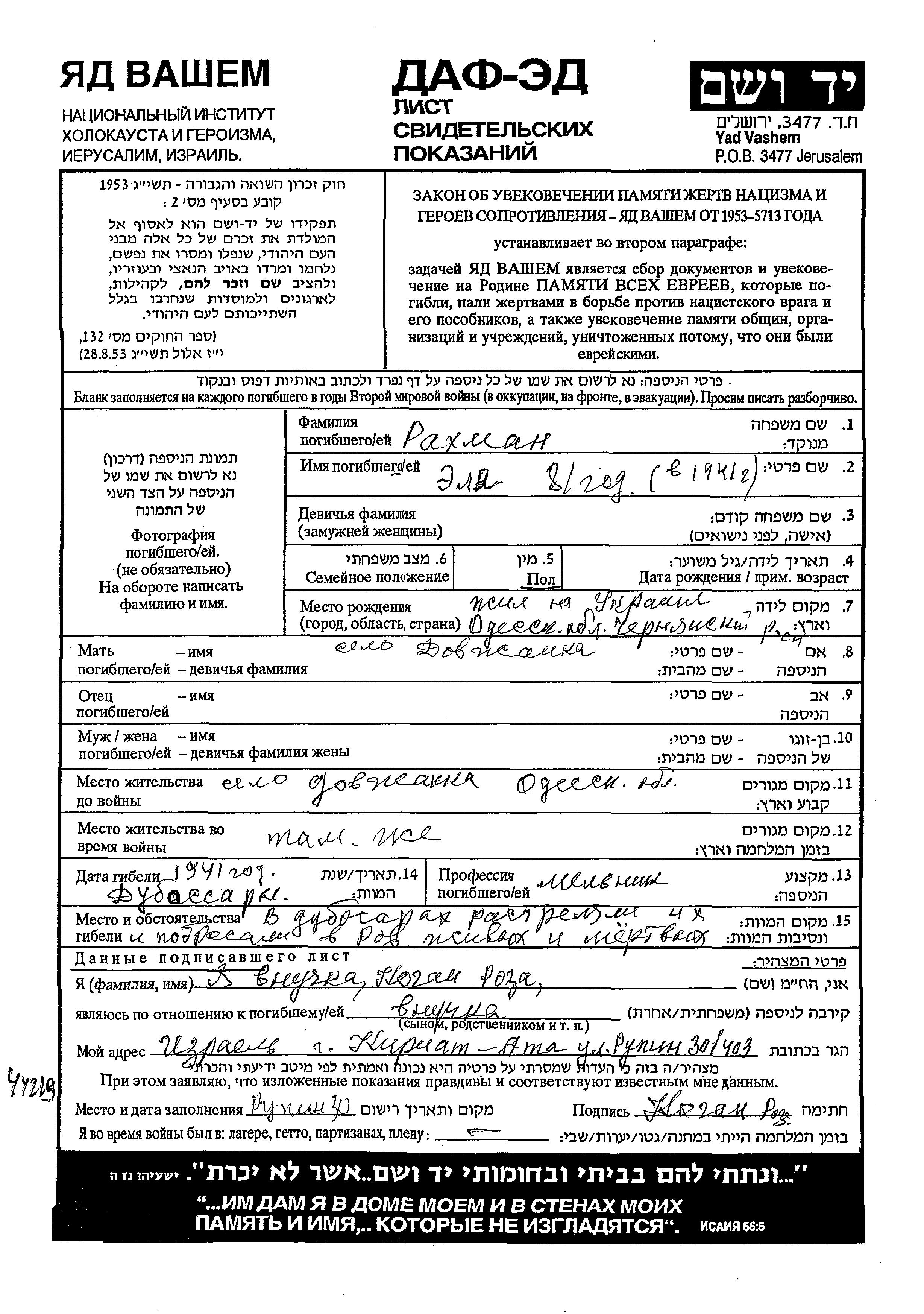 Ela Rakhman wurde in Dovzhanka, Ukraine (UdSSR) geboren. Sie war Müller und Verheiratet. Vor dem Zweiten Weltkrieg lebte sie in Dovzhanka, Ukraine (UdSSR). Während des Krieges war sie in Dovzhanka, Ukraine (UdSSR).