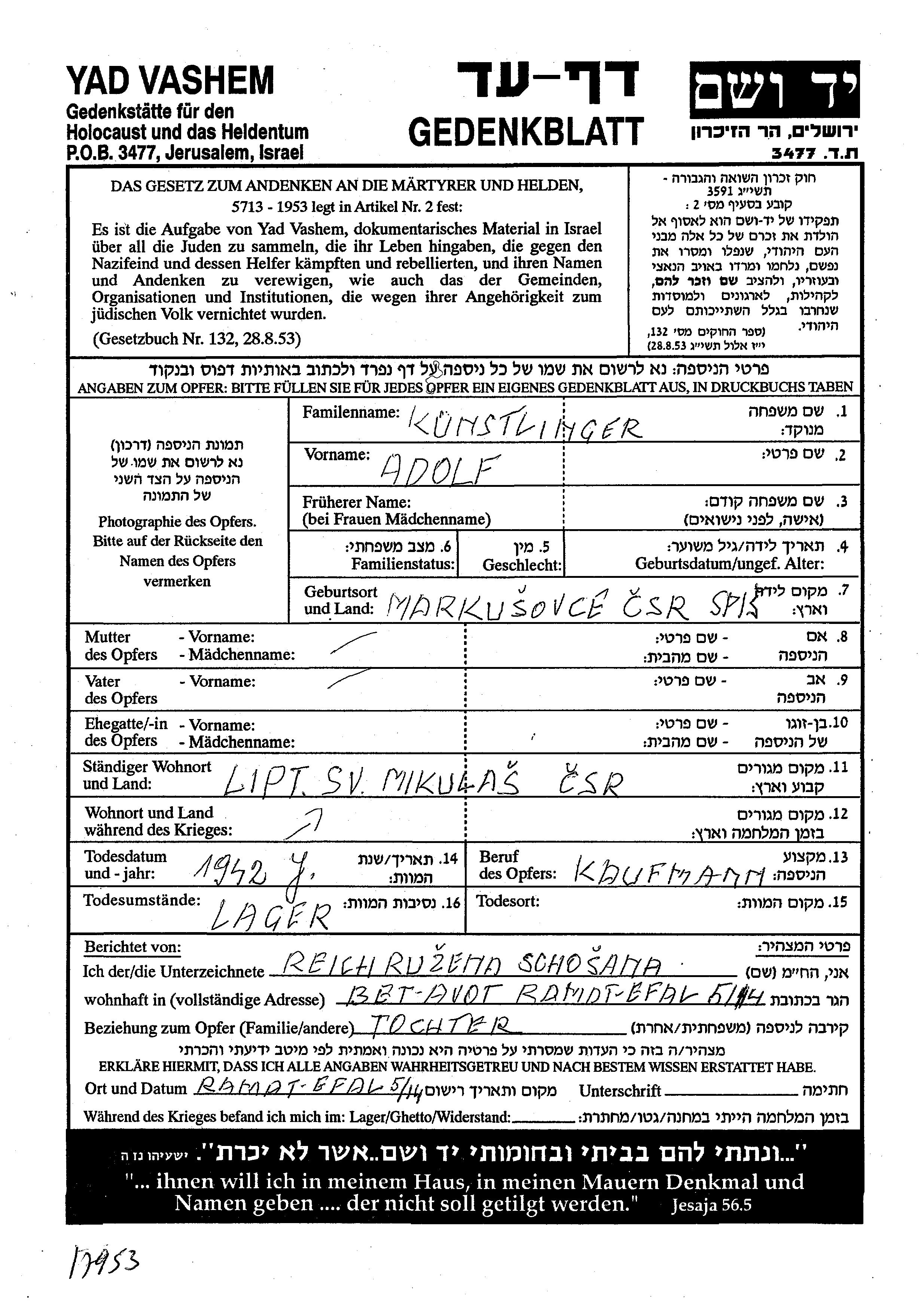 Adolf Kunstlinger wurde in Markusovce, Tschechoslowakei geboren. Er war Kaufmann/-frau. Vor dem Zweiten Weltkrieg lebte er in Lipt Svaty Mikulas, Tschechoslowakei. Während des Krieges war er in Lipt Svaty Mikulas, Tschechoslowakei.