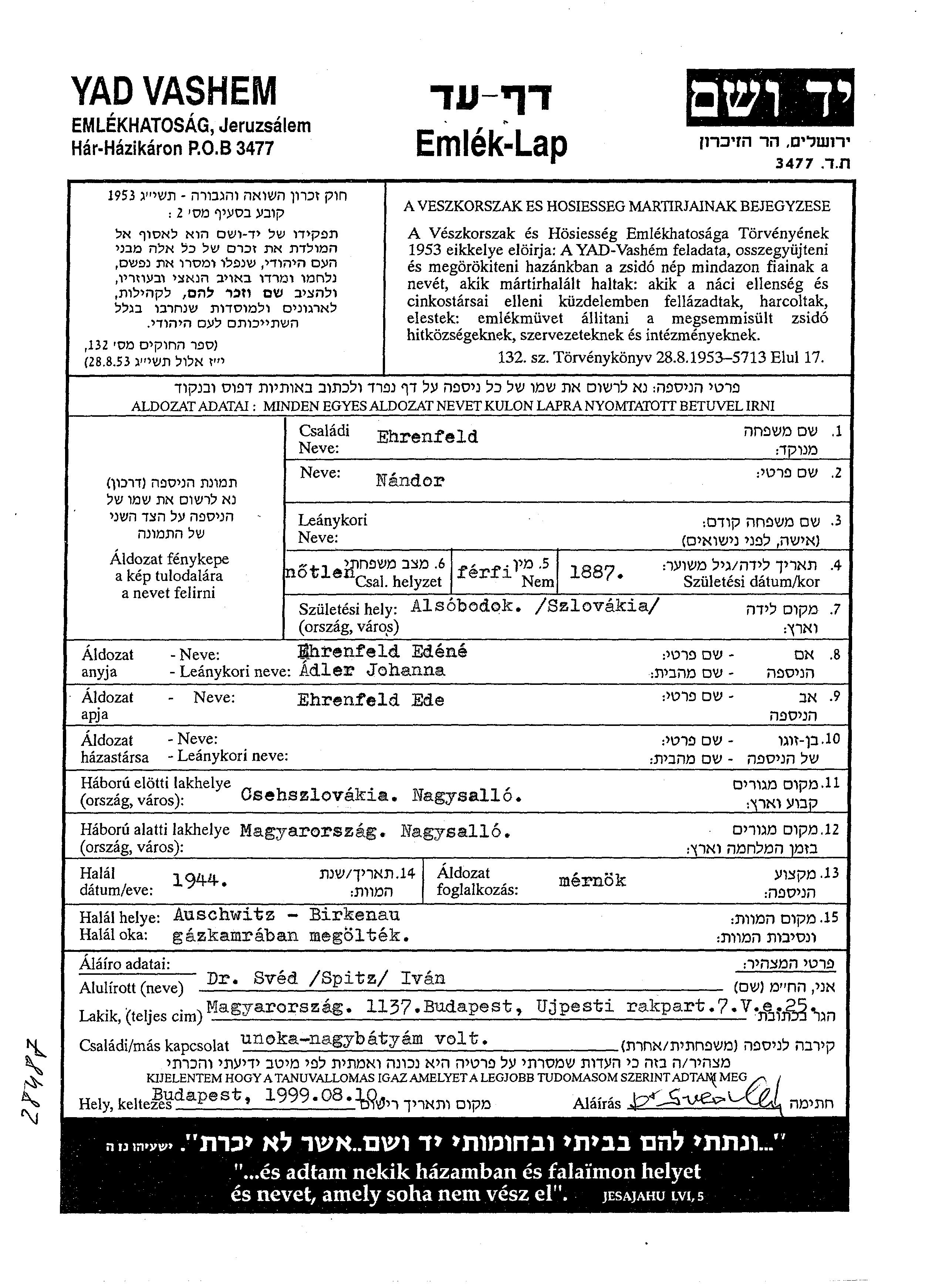 Nandor Ehrenfeld wurde im Jahr 1887 in Alsobodok, Tschechoslowakei geboren. Er war der Sohn von Ede und Johanna. Er war Ingenieur und Ledig. Vor dem Zweiten Weltkrieg lebte er in Nagysallo, Tschechoslowakei. Während des Krieges war er in Nagysallo, Tschechoslowakei.