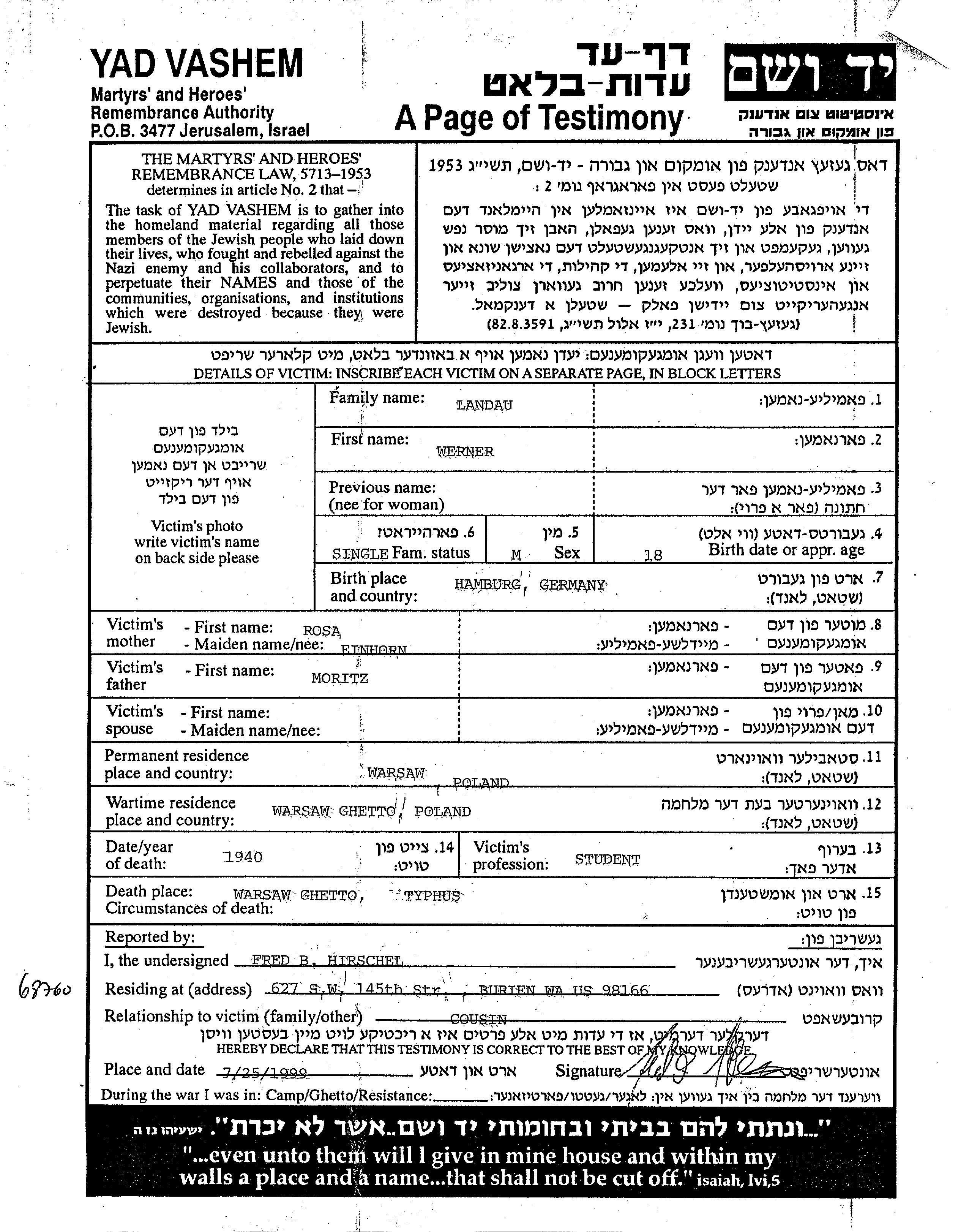 Werner Landau wurde im Jahr 1922 in Hamburg, Deutsches Reich geboren. Er war der Sohn von Moritz und Rosa. Er war Student und Ledig. Vor dem Zweiten Weltkrieg lebte er in Warsaw, Polen. Während des Krieges war er in Warsaw, Polen.