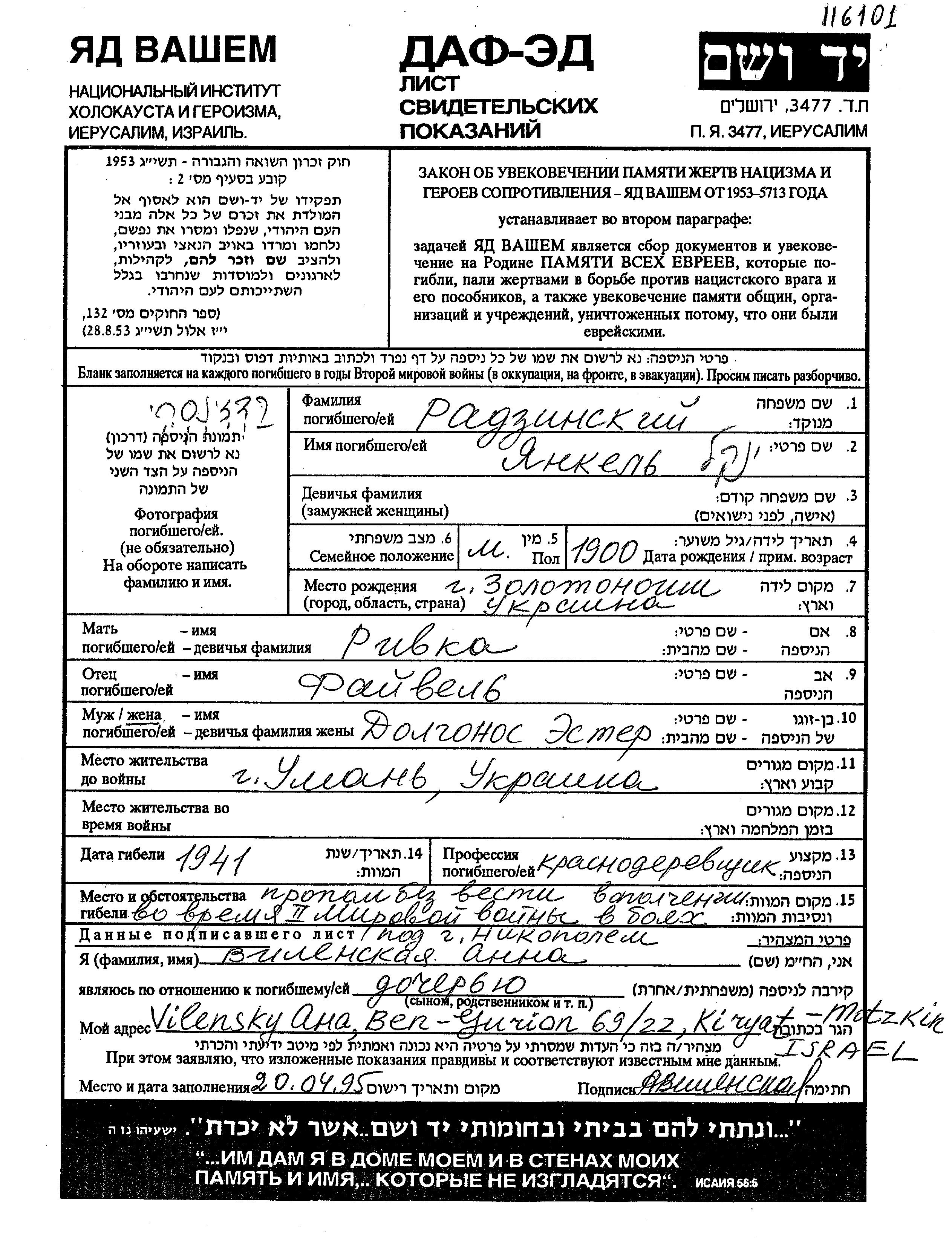 Yankel Radzinski wurde im Jahr 1900 in Zolotonosha, Ukraine (UdSSR) geboren. Er war der Sohn von Faivel und Rivka. Er war Tischler und mit Ester Verheiratet. Vor dem Zweiten Weltkrieg lebte er in Uman, Ukraine (UdSSR).