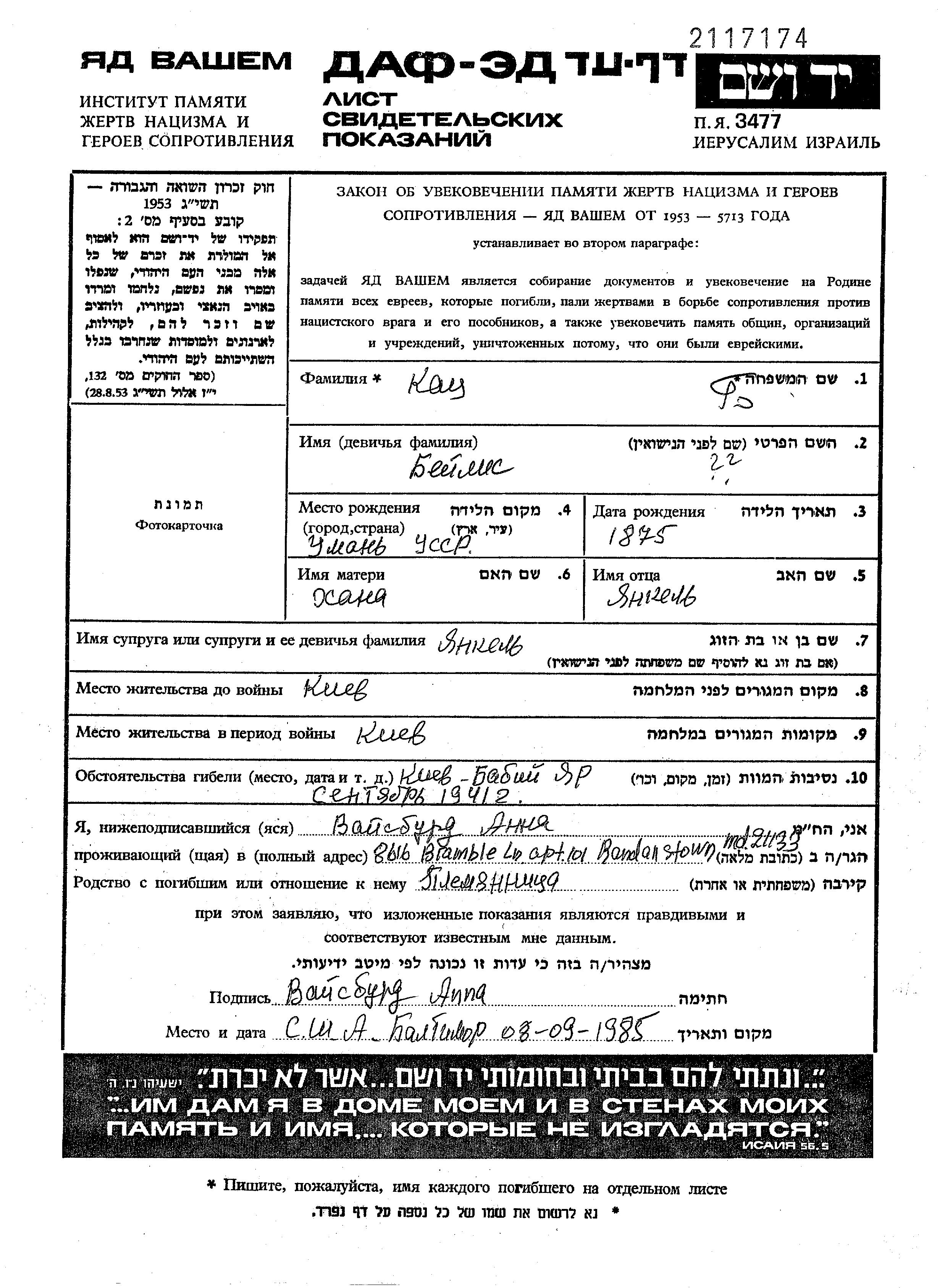 Vorname unbekannt Katz, geb. Beilis wurde in Uman, Ukraine (UdSSR) geboren. Sie war die Tochter von Yankel und Khana. Sie war mit Yankel Verheiratet. Vor dem Zweiten Weltkrieg lebte sie in Kiyev, Ukraine (UdSSR). Während des Krieges war sie in Kiyev, Ukraine (UdSSR).