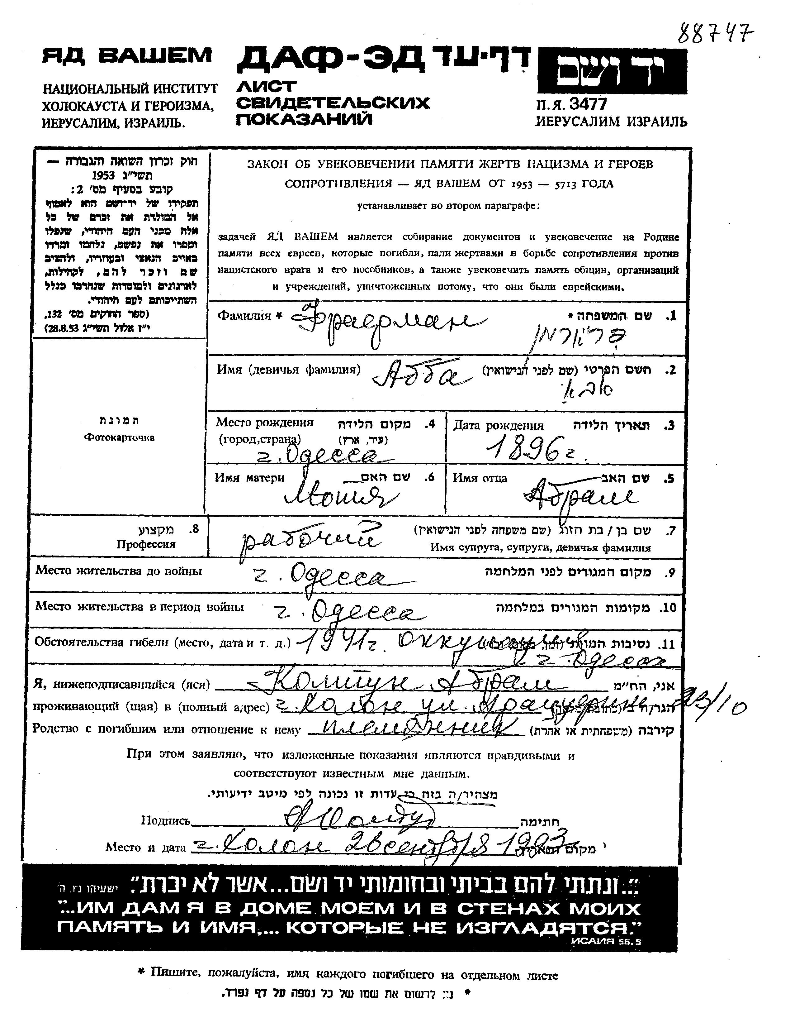 Aba wurde in der Schoah ermordet. Todesort: Odessa, Ukraine (UdSSR) im Jahr 1941.