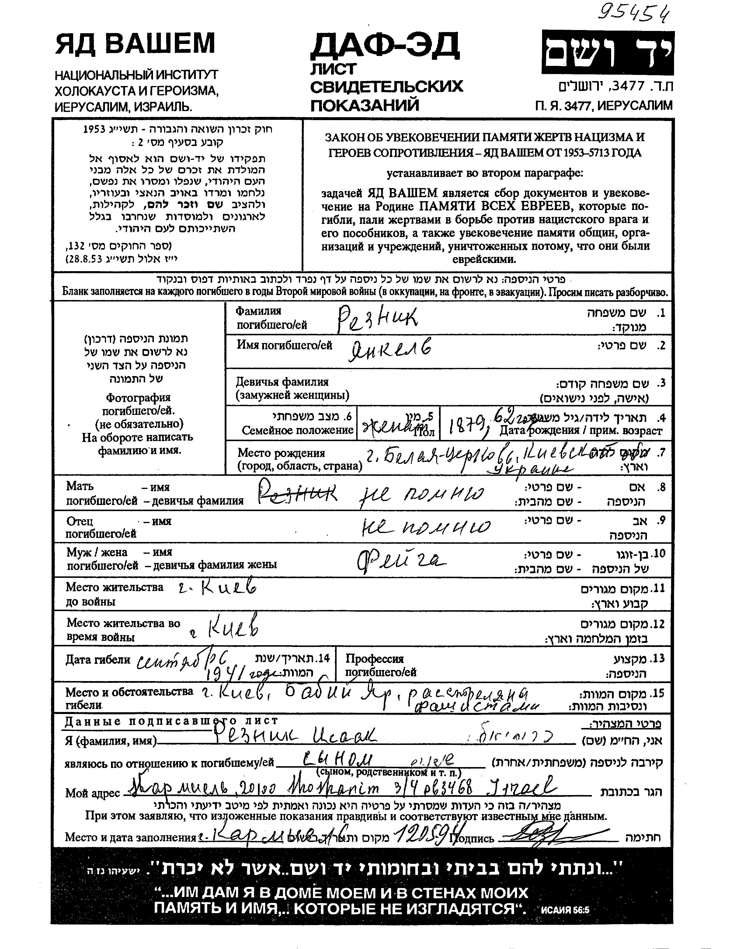 Yankel Reznik wurde im Jahr 1879 in Belaya Tserkov, Ukraine (UdSSR) geboren. Er war mit Feiga Verheiratet. Vor dem Zweiten Weltkrieg lebte er in Kiyev, Ukraine (UdSSR). Während des Krieges war er in Kiyev, Ukraine (UdSSR).