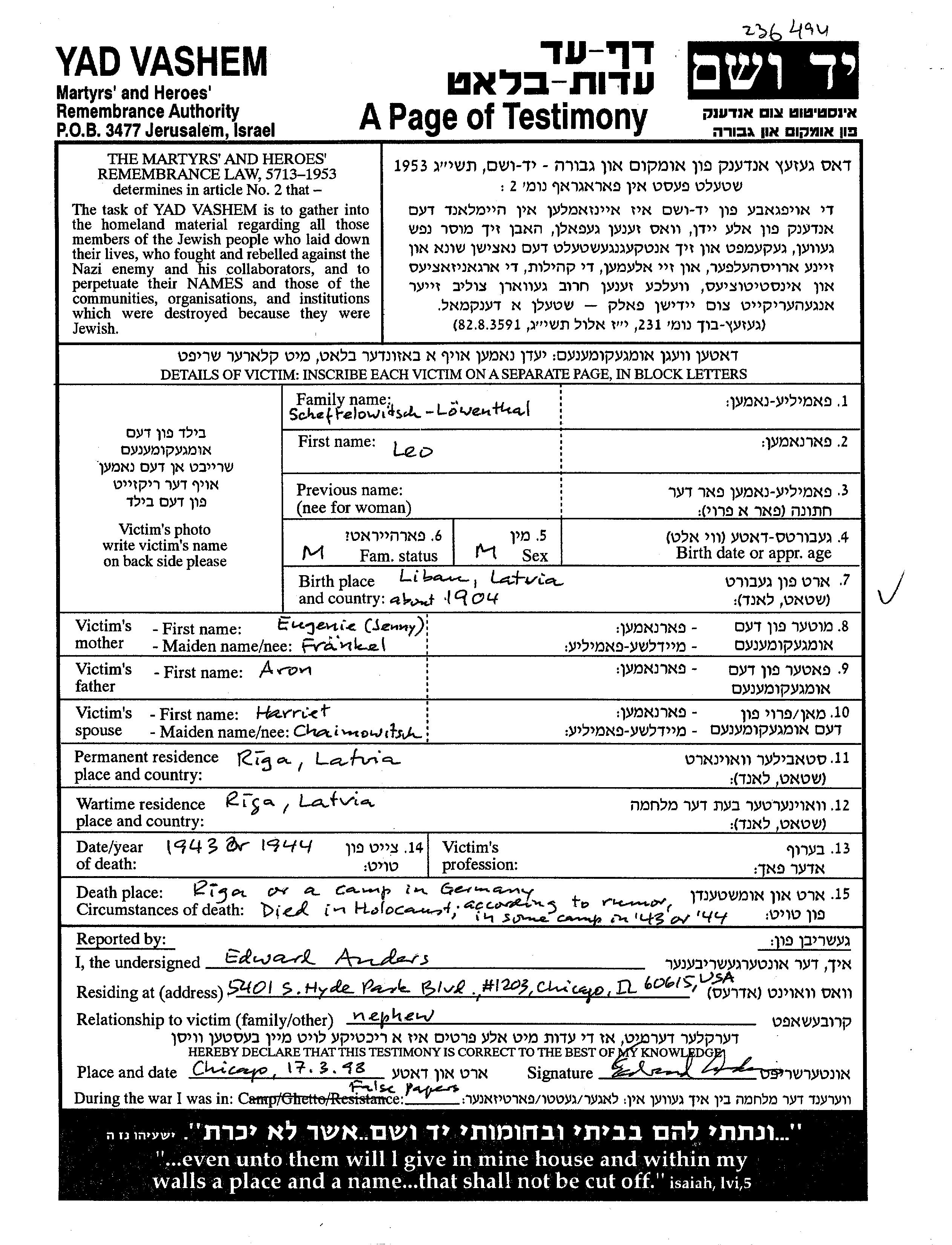 Leo Scheftelowitsch Löwenthal wurde im Jahr 1904 in Libau, Lettland geboren. Er war der Sohn von Aron und Eugenie Senny, geb. Fränkel. Er war mit Harriet Verheiratet. Vor dem Zweiten Weltkrieg lebte er in Riga, Lettland. Während des Krieges war er in Riga, Lettland.