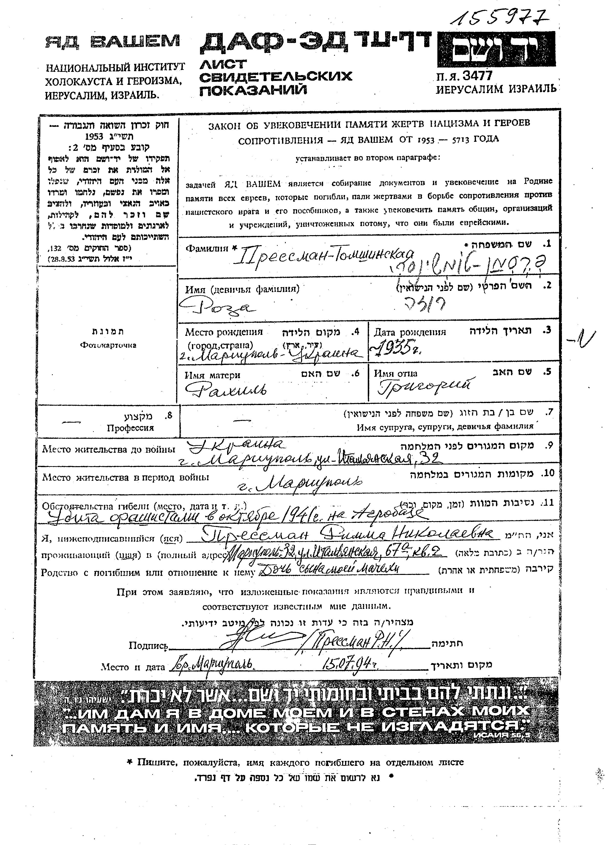 Roza Tomshinski Presman wurde im Jahr 1935 in Mariupol, Ukraine (UdSSR) geboren. Sie war die Tochter von Grigori und Rakhil. Sie war Schneider und Verheiratet. Vor dem Zweiten Weltkrieg lebte sie in Mariupol, Ukraine (UdSSR). Während des Krieges war sie in Mariupol, Ukraine (UdSSR).