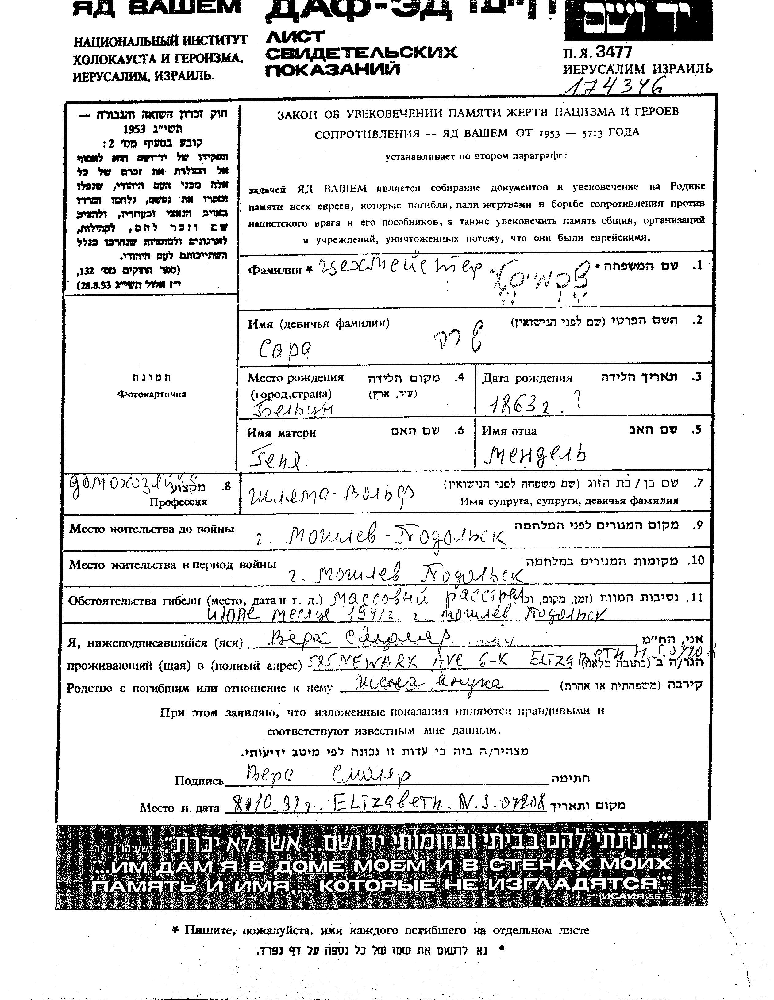Sara Tzekhmeister wurde im Jahr 1863 in Balti, Rumänien geboren. Sie war die Tochter von Mendel und Genya. Sie war Hausfrau und mit Shlyoma Volf Verheiratet. Vor dem Zweiten Weltkrieg lebte sie in Mogilev Podolski, Ukraine (UdSSR). Während des Krieges war sie in Mogilev Podolski, Ukraine (UdSSR).