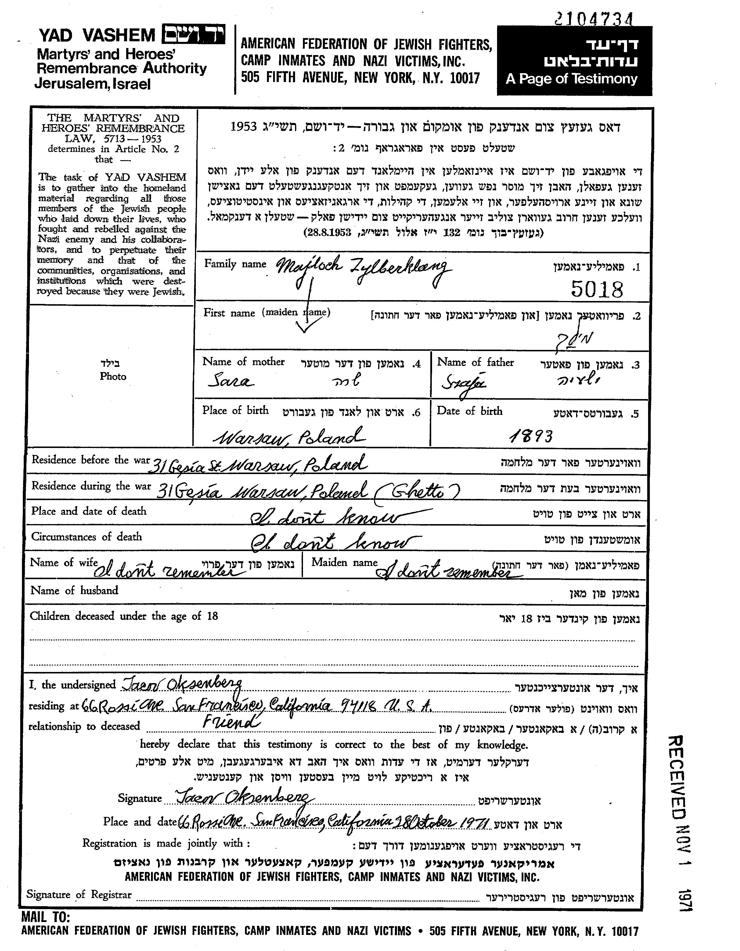 Aufenthaltsort während des Krieges/Schoah