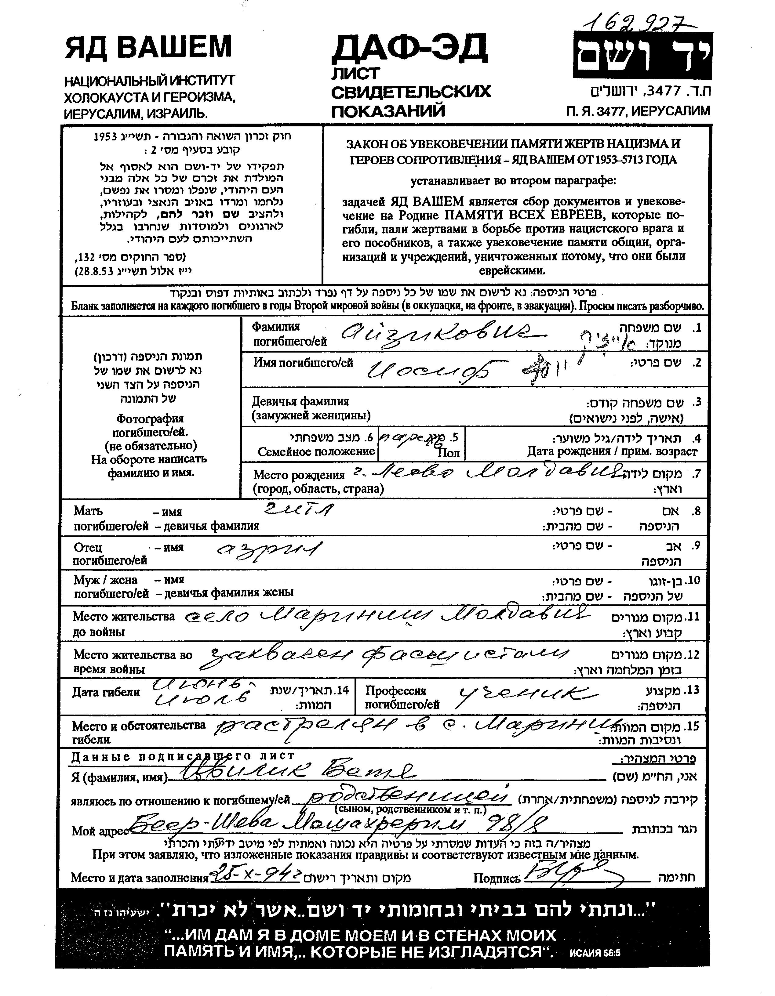 Iosif Aizikovich wurde in Leova, Rumänien geboren. Er war der Sohn von Azril und Gitl. Er war Schüler/-in und Kind. Vor dem Zweiten Weltkrieg lebte er in Marinish, Rumänien. Während des Krieges war er in Marinish, Rumänien.