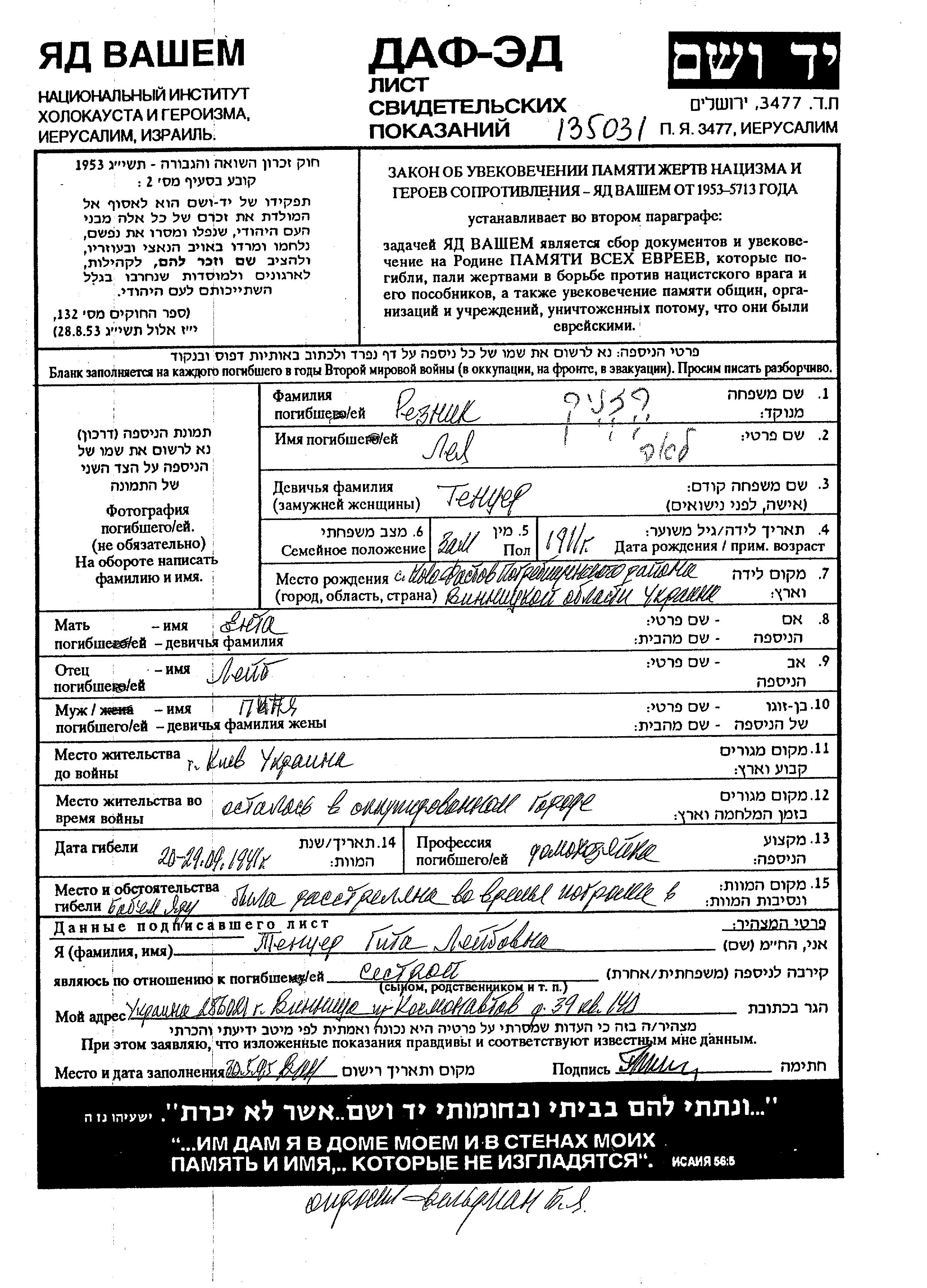 Lea Reznik, geb. Tentzer wurde im Jahr 1911 in Novofastov, Ukraine (UdSSR) geboren. Sie war die Tochter von Leib und Yenta. Sie war Hausfrau und mit Pinia Verheiratet. Vor dem Zweiten Weltkrieg lebte sie in Kiyev, Ukraine (UdSSR). Während des Krieges war sie in Kiyev, Ukraine (UdSSR).