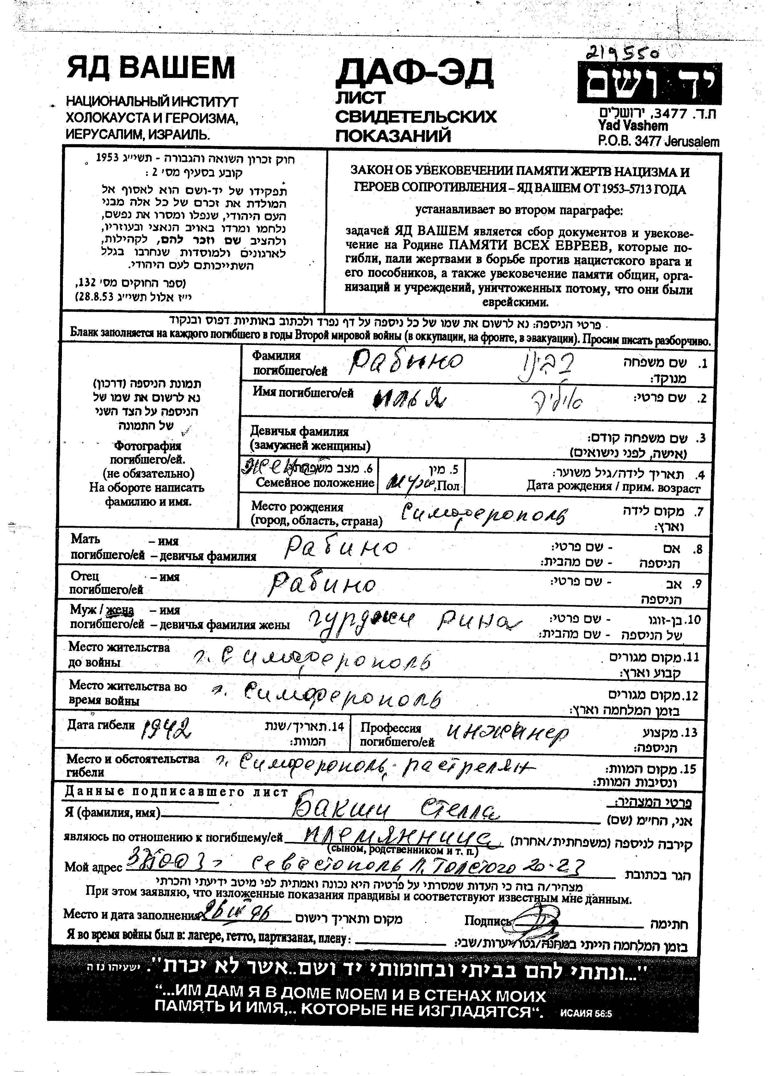 Ilya Rabino wurde in Simferopol, Russland (UdSSR) geboren. Er war Ingenieur und mit Rina Verheiratet. Vor dem Zweiten Weltkrieg lebte er in Simferopol, Russland (UdSSR). Während des Krieges war er in Simferopol, Russland (UdSSR).
