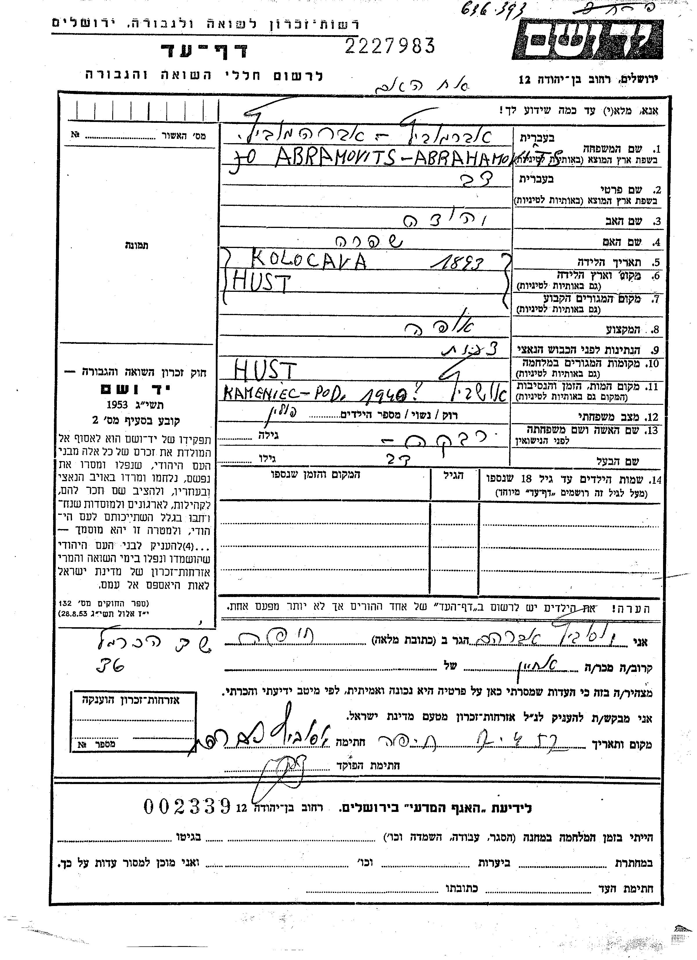 Dov Abramovits wurde im Jahr 1893 in Kolocava, Tschechoslowakei geboren. Er war der Sohn von Yehuda und Shifra. Er war Bäcker/-in und mit Rivka Verheiratet. Vor dem Zweiten Weltkrieg lebte er in Hust, Tschechoslowakei. Während des Krieges war er in Kamenets Podolskiy, Ukraine (UdSSR).