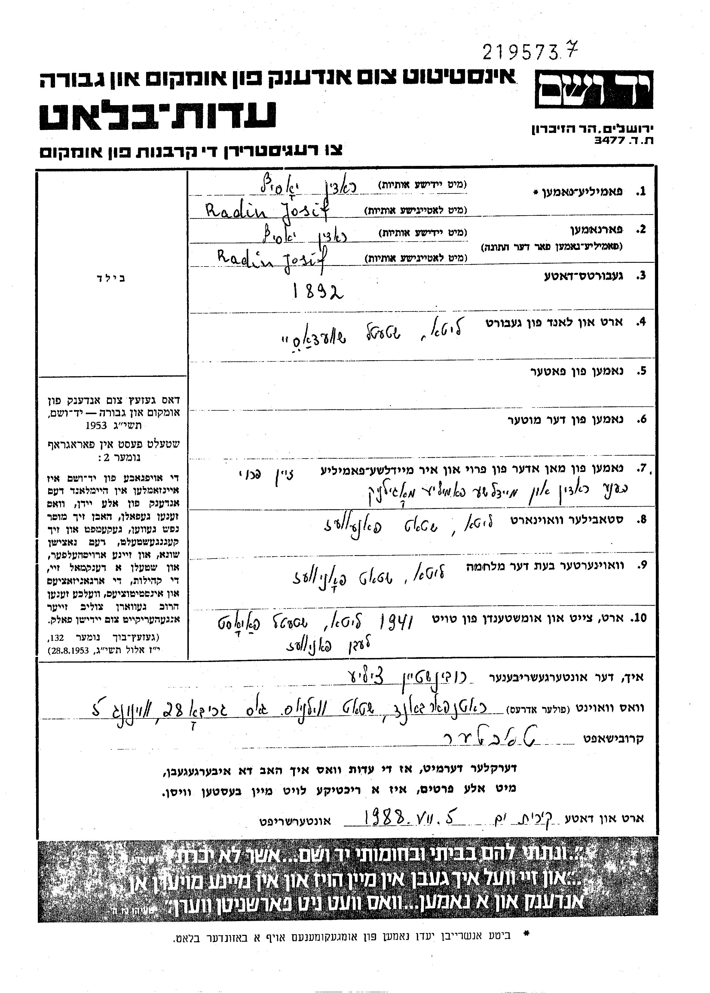 Josif Radin wurde im Jahr 1892 in Svedasai, Litauen geboren. Er war mit Hene Verheiratet. Vor dem Zweiten Weltkrieg lebte er in Panevezys, Litauen. Während des Krieges war er in Panevezys, Litauen.
