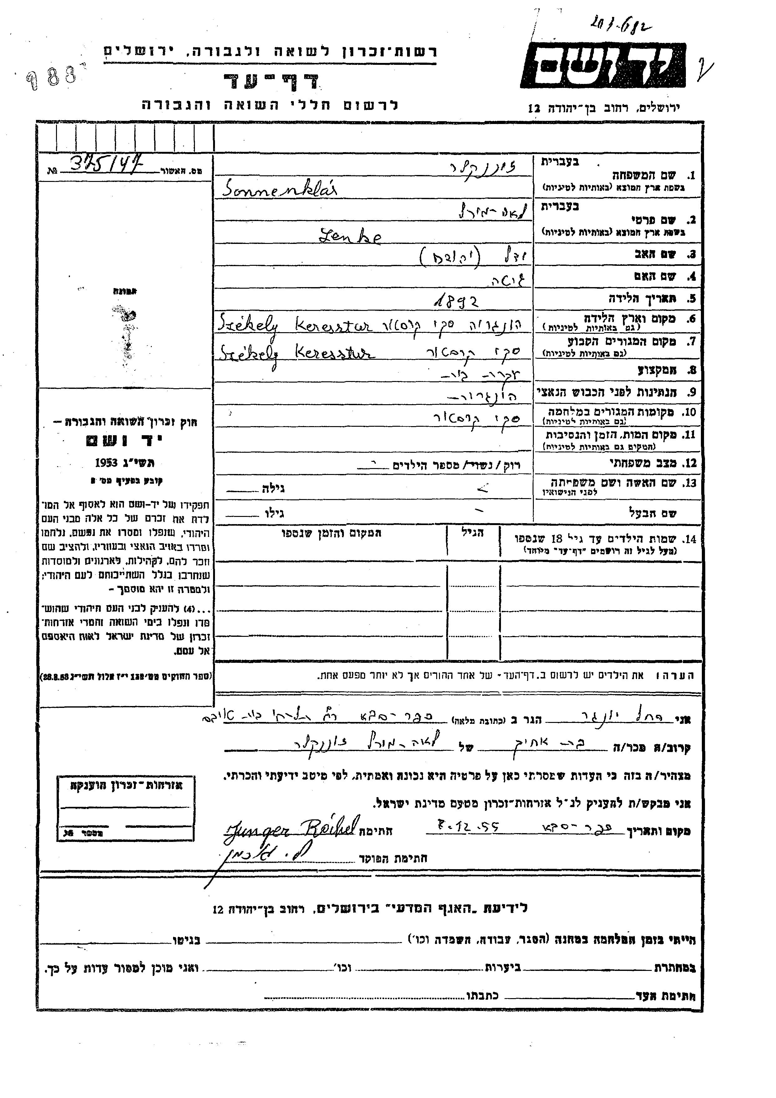 Lenka Lea Mirl Sonnenklar wurde im Jahr 1892 in Szekely, Ungarn geboren. Sie war die Tochter von Yehuda Jidel und Gita. Sie war Hausfrau. Vor dem Zweiten Weltkrieg lebte sie in Szekely, Ungarn. Während des Krieges war sie in Szekely, Ungarn.