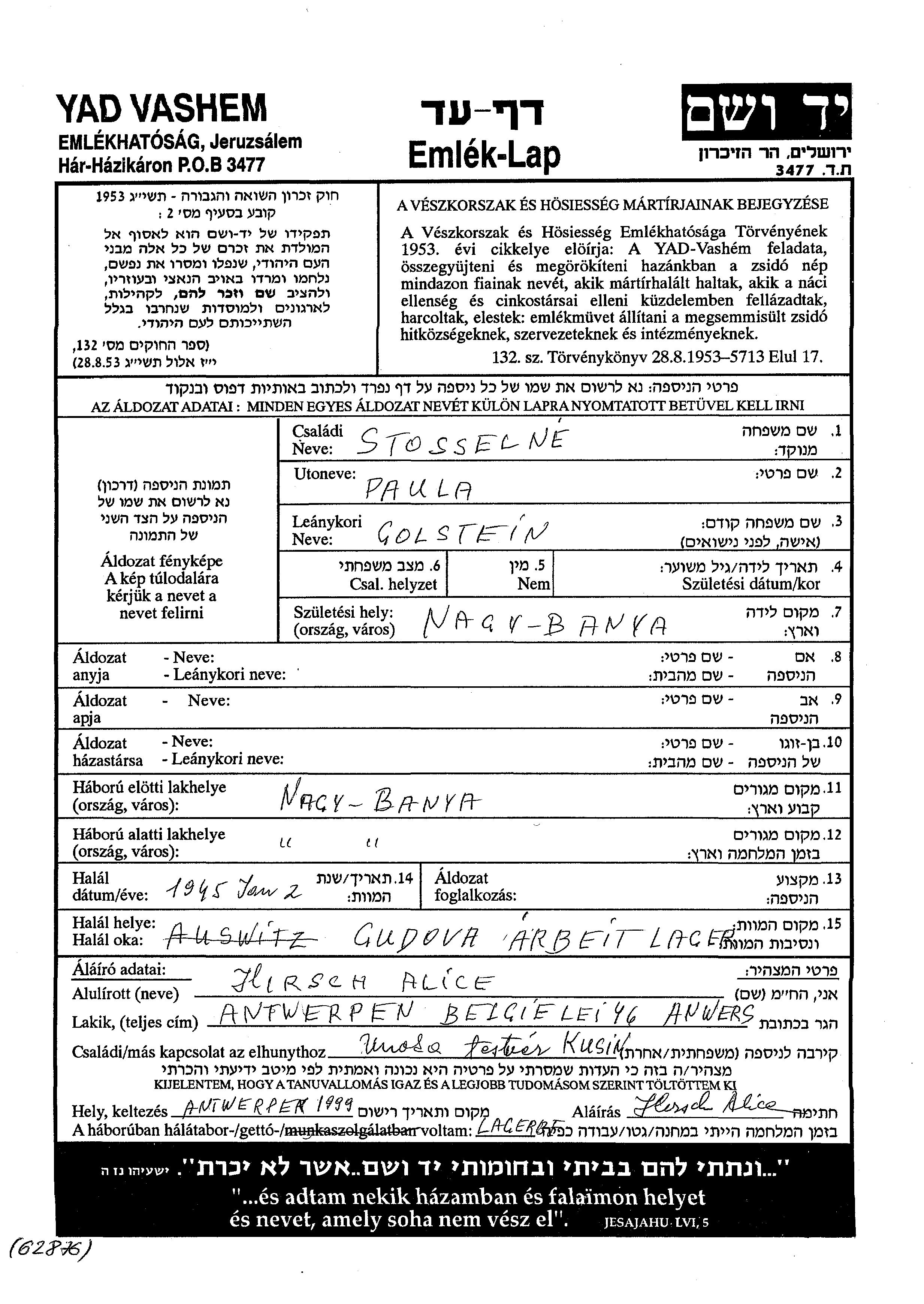 Paula Stossel, geb. Golstein wurde in Nagy Banya, Rumänien geboren. Vor dem Zweiten Weltkrieg lebte sie in Nagy Banya, Rumänien. Während des Krieges war sie in Nagy Banya, Rumänien.