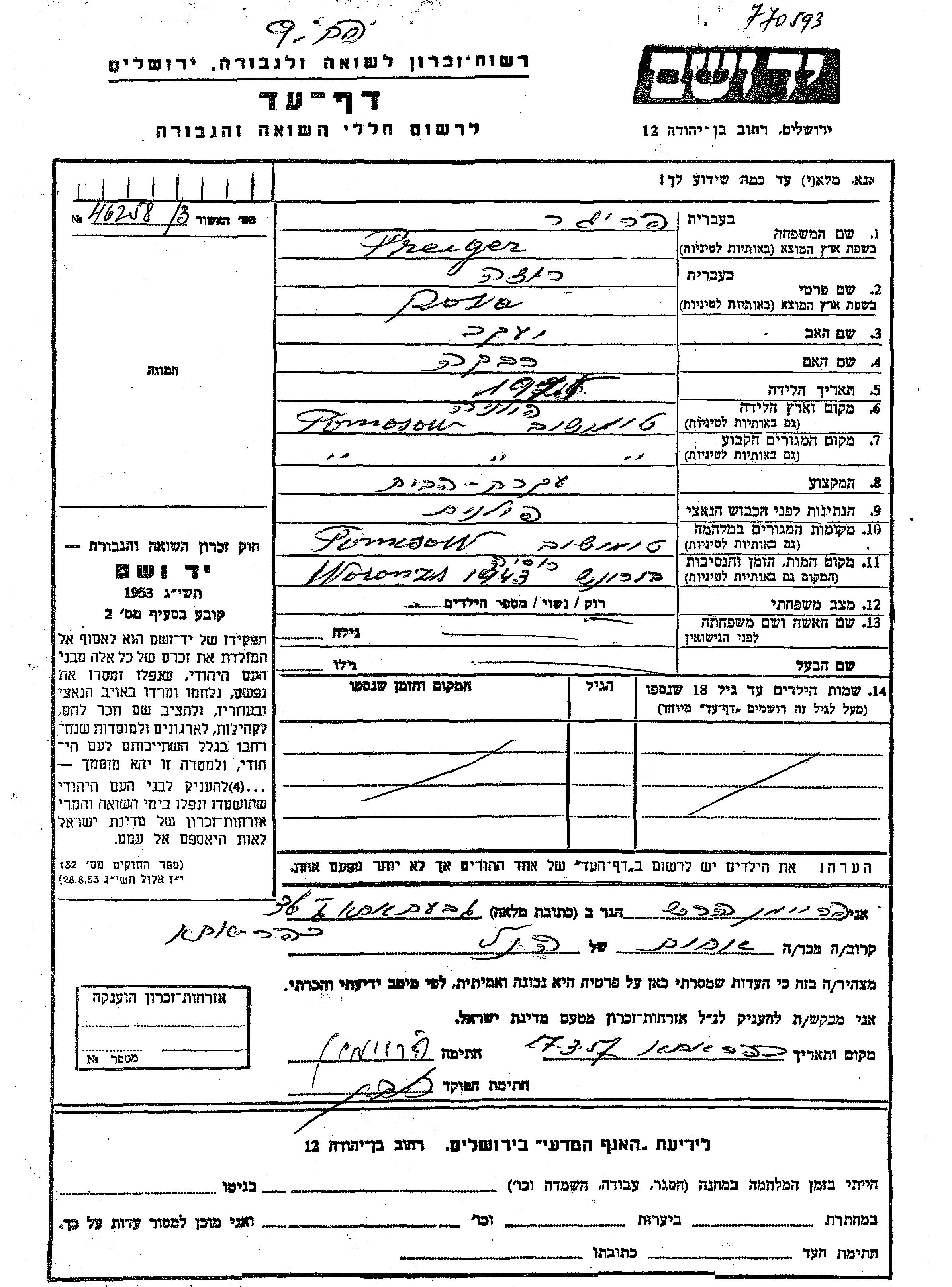 Roza Preiger Friger wurde im Jahr 1915 in Tomaszow, Polen geboren. Sie war die Tochter von Yaakov und Rivka. Sie war Hausfrau und Ledig. Vor dem Zweiten Weltkrieg lebte sie in Tomaszow, Polen. Während des Krieges war sie in Tomaszow, Polen.