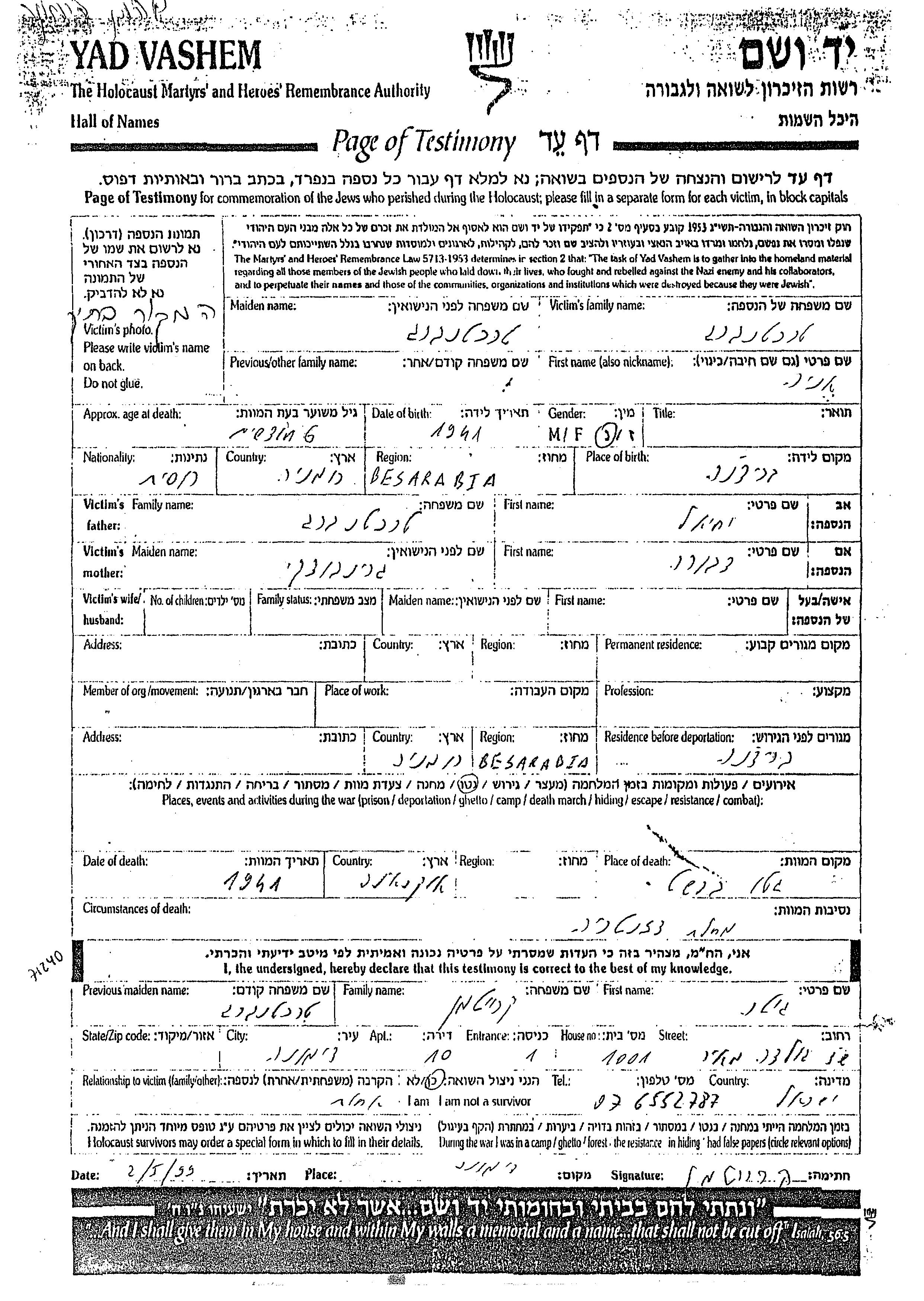 Trakhtenberg Ana 1941 Briceva, Rumänien Gedenkblatt
