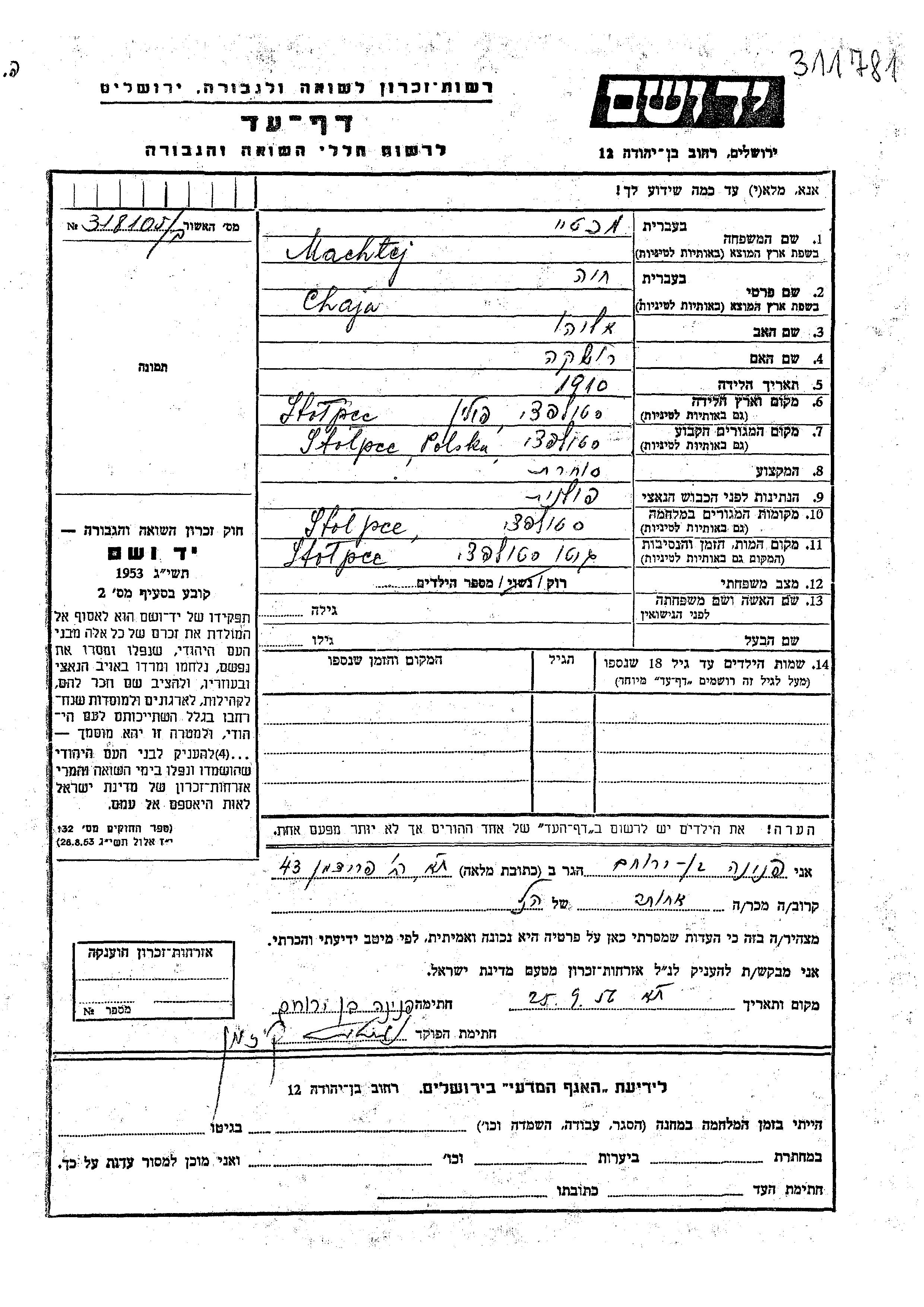Chaia Machtei wurde im Jahr 1910 in Stolpce, Polen geboren. Sie war die Tochter von Eliahu und Rakhel. Sie war Kaufmann/-frau und Ledig. Vor dem Zweiten Weltkrieg lebte sie in Stolpce, Polen. Während des Krieges war sie in Stolpce, Polen.