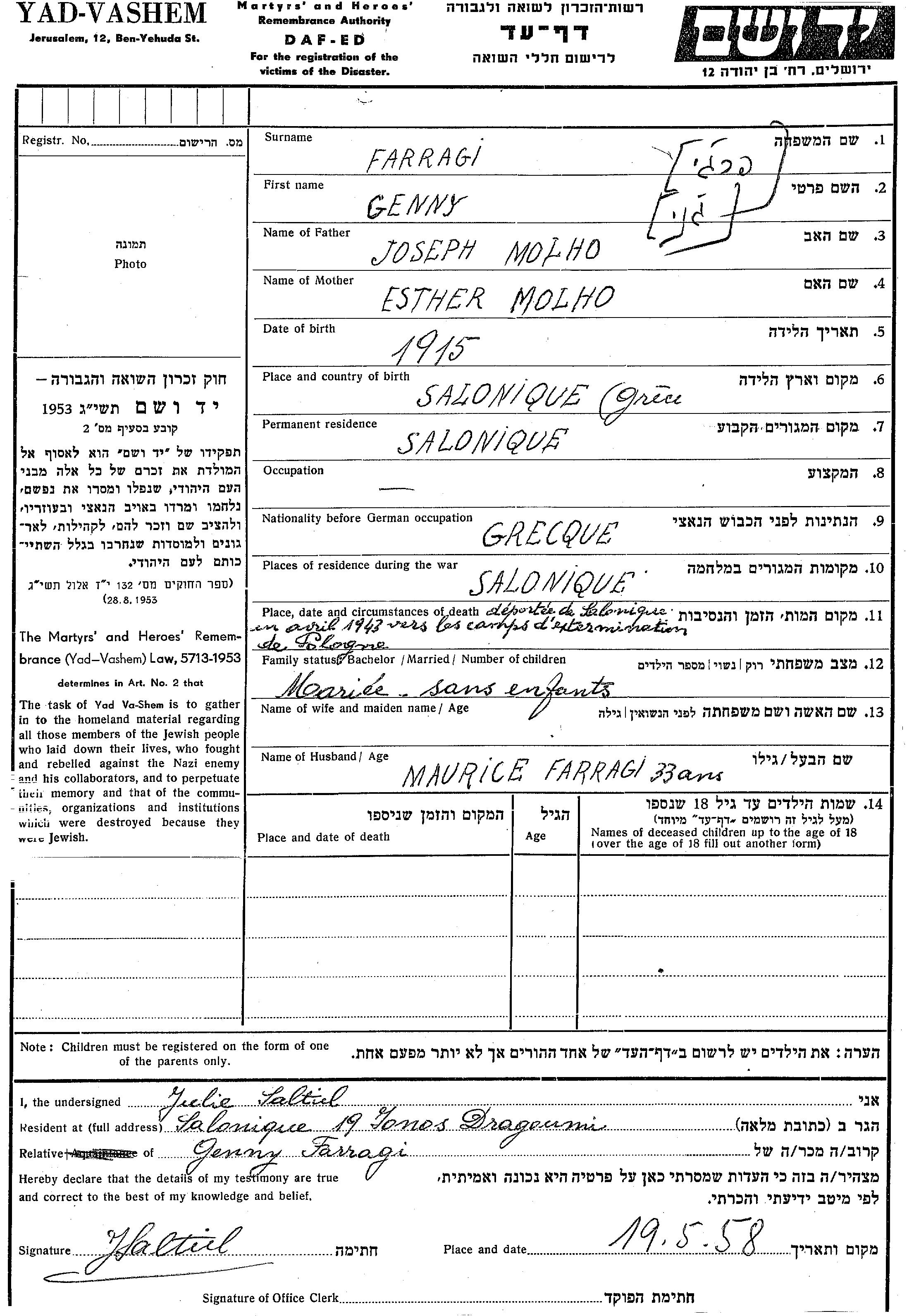 Genny Farragi, geb. Molho wurde im Jahr 1915 in Salonique, Griechenland geboren. Sie war die Tochter von Joseph und Esther. Sie war mit Maurice Verheiratet. Vor dem Zweiten Weltkrieg lebte sie in Salonique, Griechenland. Während des Krieges war sie in Salonique, Griechenland.