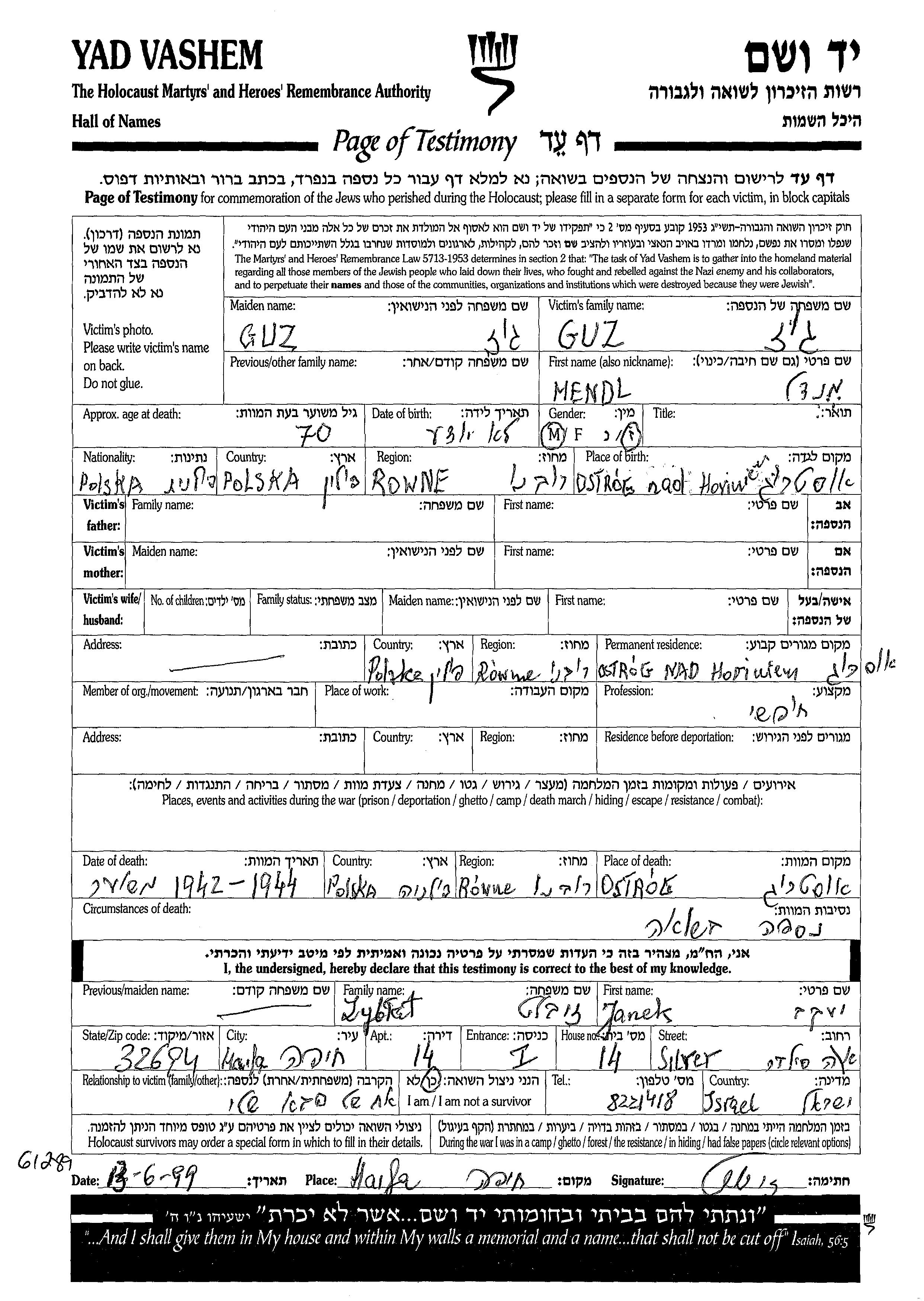 Mendl wurde in der Schoah ermordet. Todesort: Ostrog, Polen im Jahr 1942.
