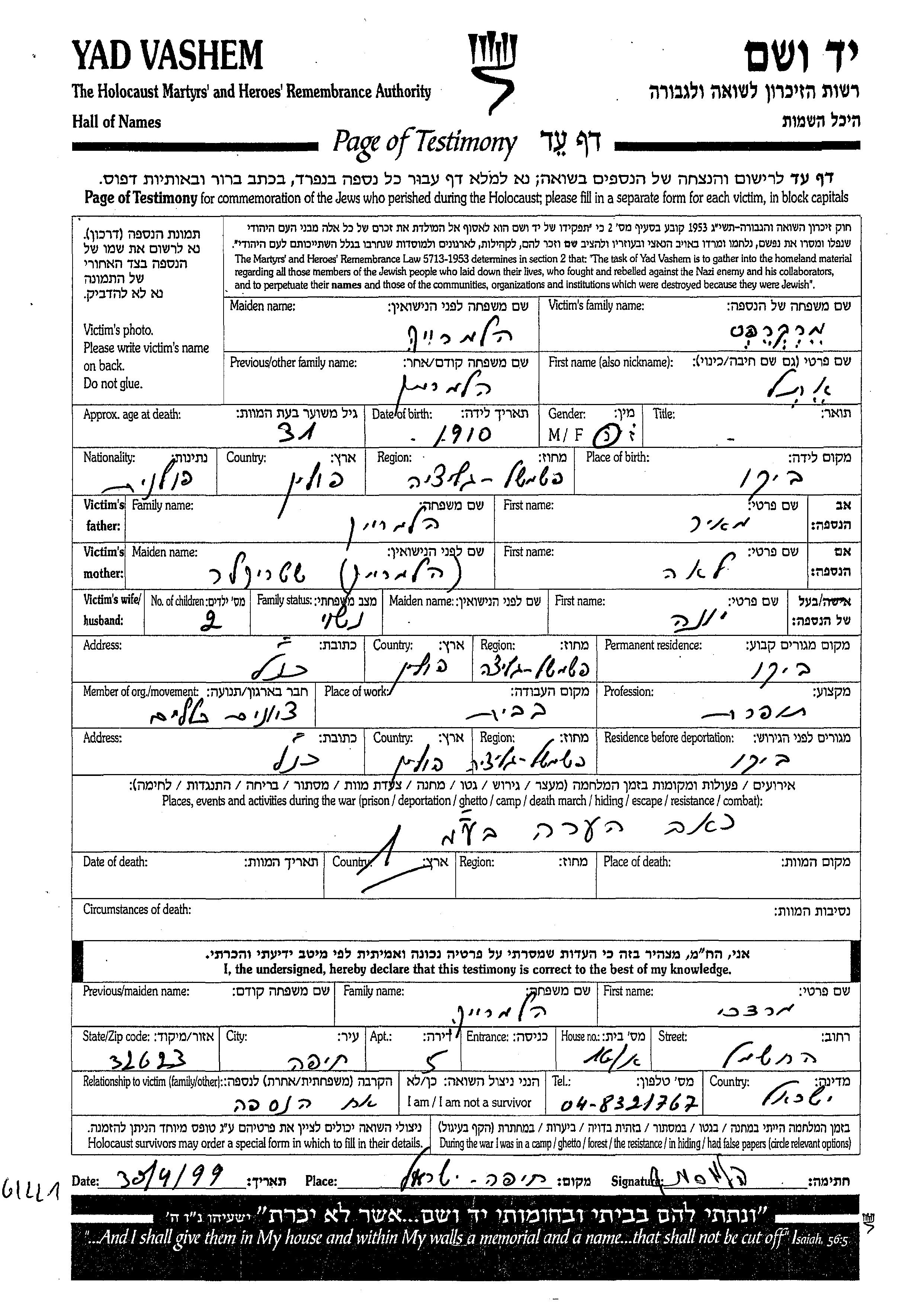 Etel Meerkrebs, geb. Helmreikh wurde im Jahr 1910 in Biko, Polen geboren. Sie war die Tochter von Meir und Lea. Sie war Schneiderin und mit Yona Verheiratet. Vor dem Zweiten Weltkrieg lebte sie in Biko, Polen. Während des Krieges war sie in Biko, Polen.