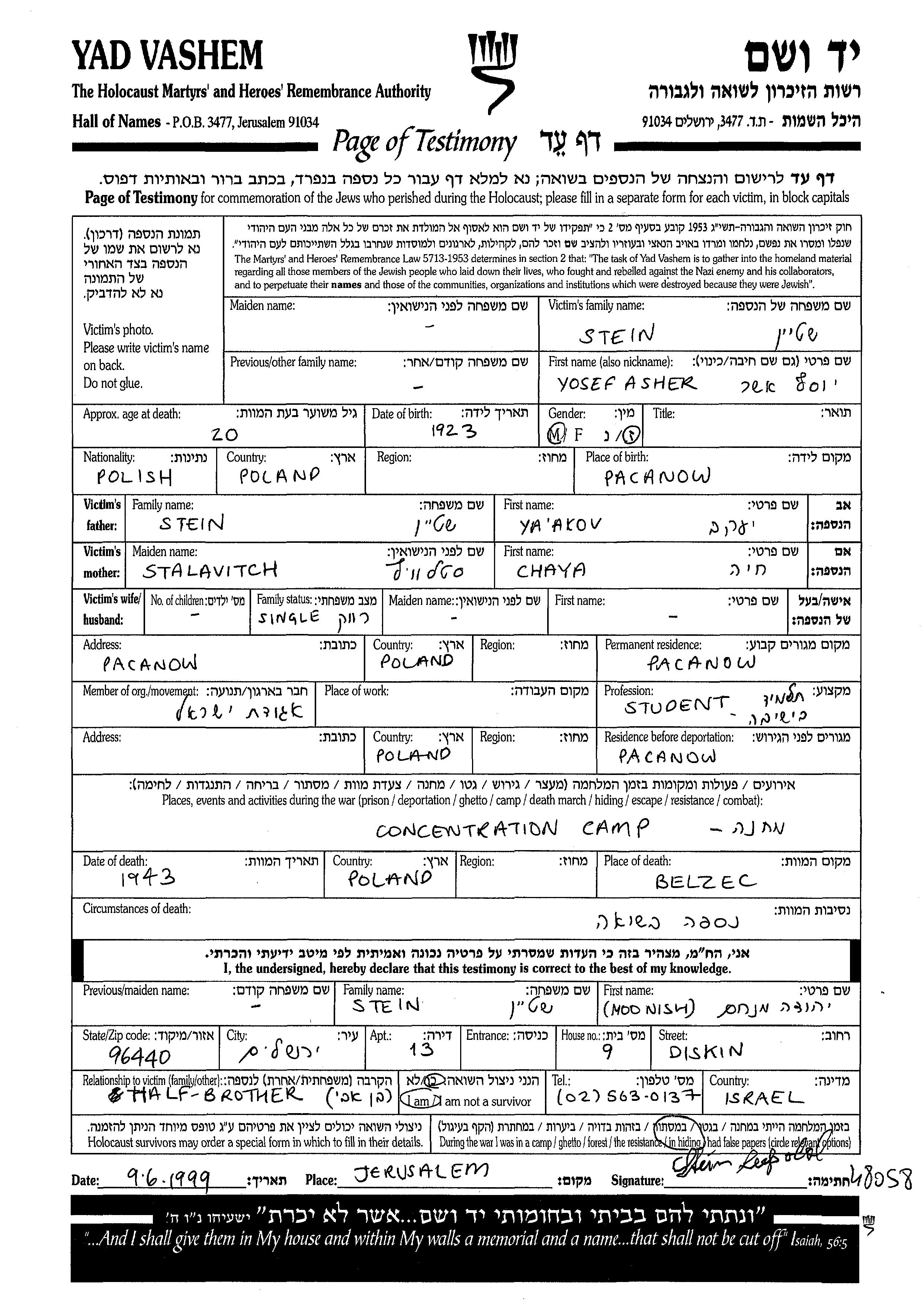Yosef Asher Stein wurde im Jahr 1923 in Pacanow, Polen geboren. Er war der Sohn von Yaakov und Chaya. Er war Jeschiwahschüler und Ledig. Vor dem Zweiten Weltkrieg lebte er in Pacanow, Polen. Während des Krieges war er in Pacanow, Polen.